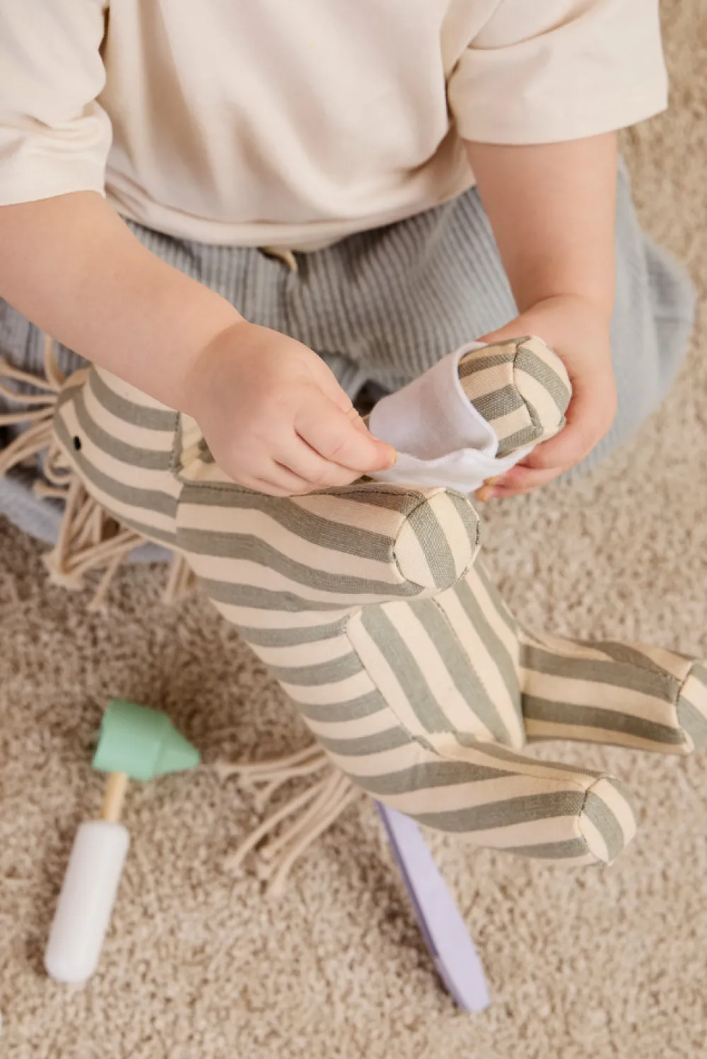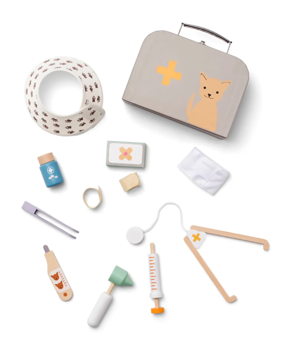 Tid til at se dyrlægen! Forbered dine udstoppede dyr til deres årlige kontrol. Dette dyrlægesæt er perfekt til børn, der elsker at tage sig af deres udstoppede dyr. Sættet indeholder en sprøjte, en medicinflaske, fiskeformet “kattemad”, et stetoskop, et termometer, en pincet og en stofhalsbånd for at forhindre dyr i at slikke deres sår efter operationen. Der er også et øreinspektionsværktøj, et otoskop, til at kontrollere dyrenes helbred. Alle dele får plads i tasken, hvilket gør det nemt at tage dyrlægeklinikkens udstyr med, hvor end legen fører dig hen. Sættet opmuntrer børn til at påtage sig rollen som dyrlæge og giver dem mulighed for at udforske omsorg og ansvar, mens de engagerer sig i kreativ leg med deres dyr.