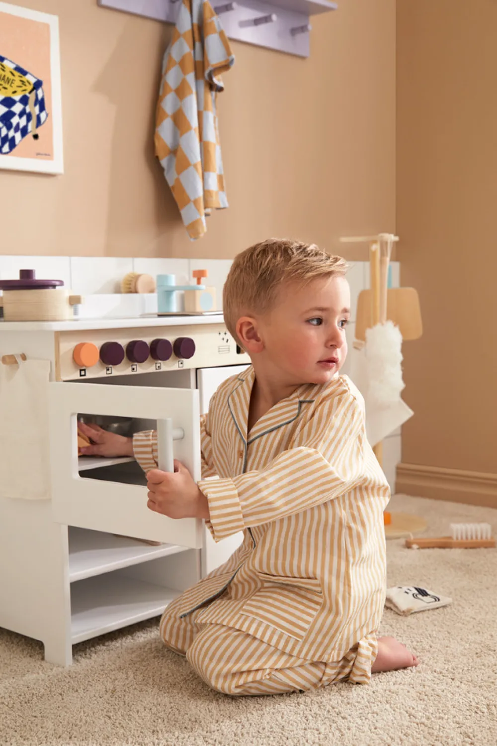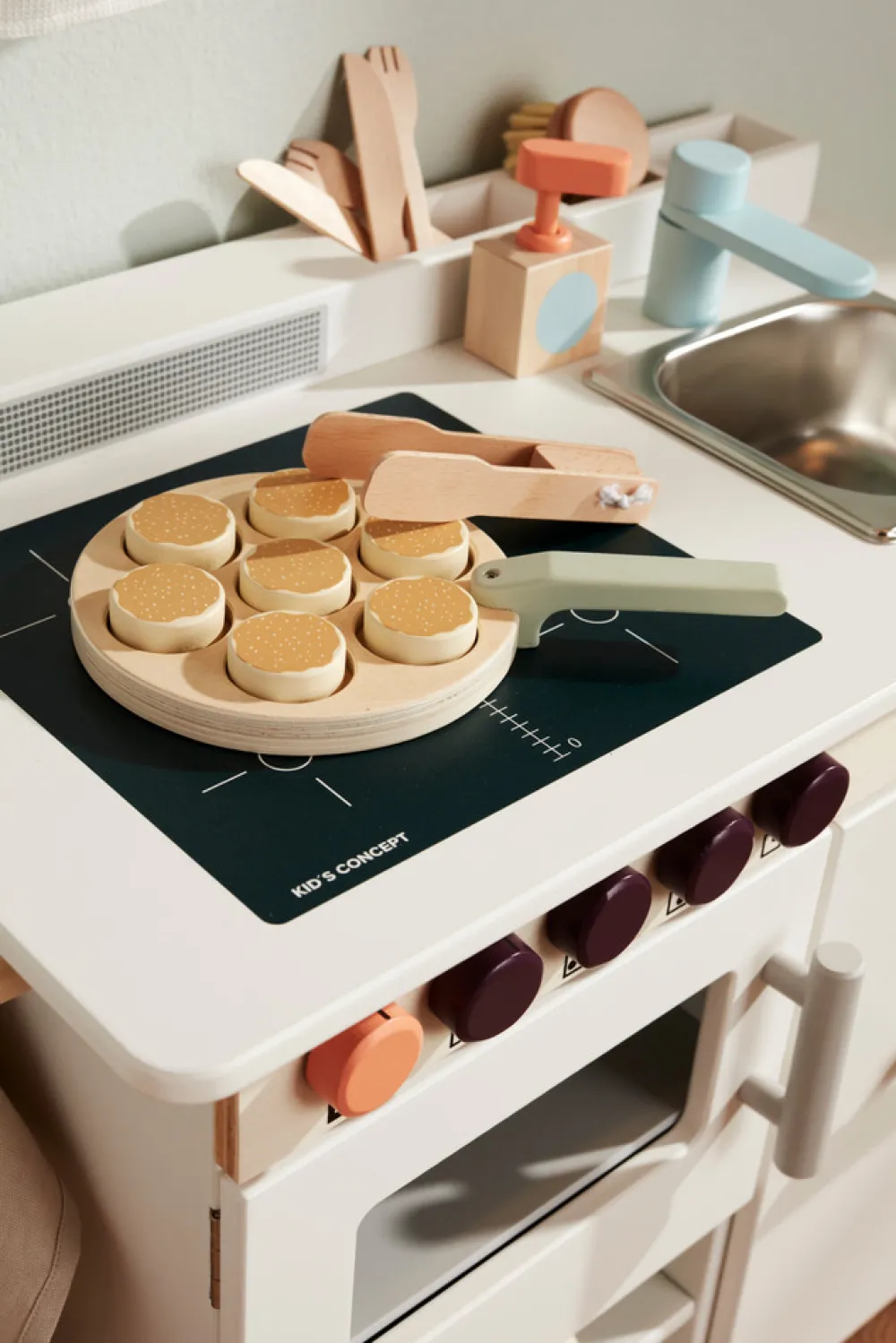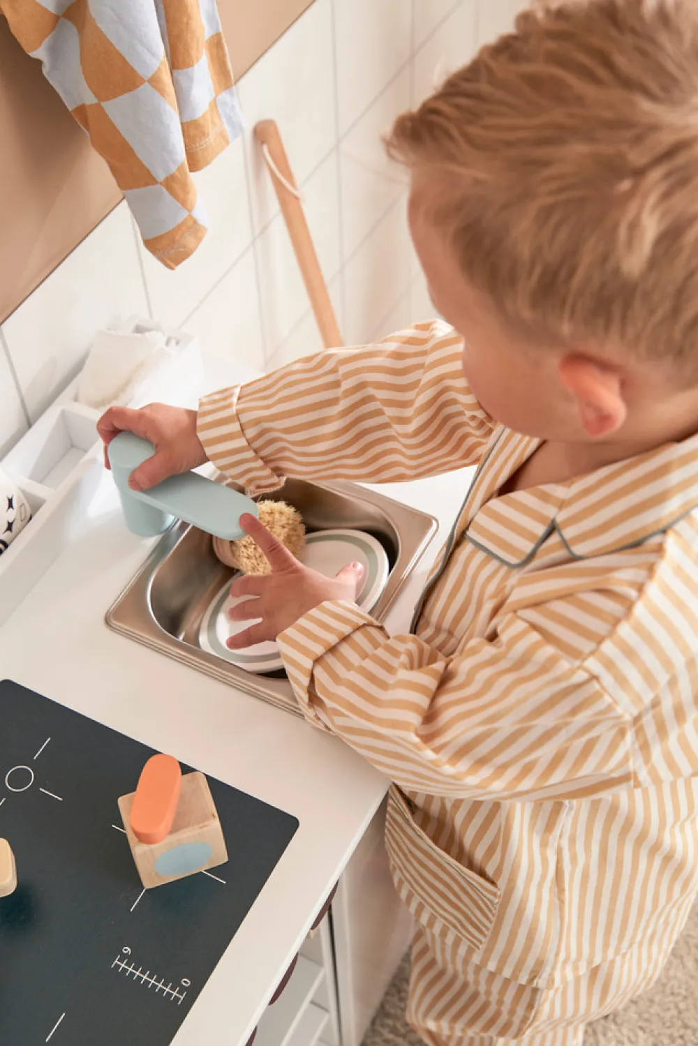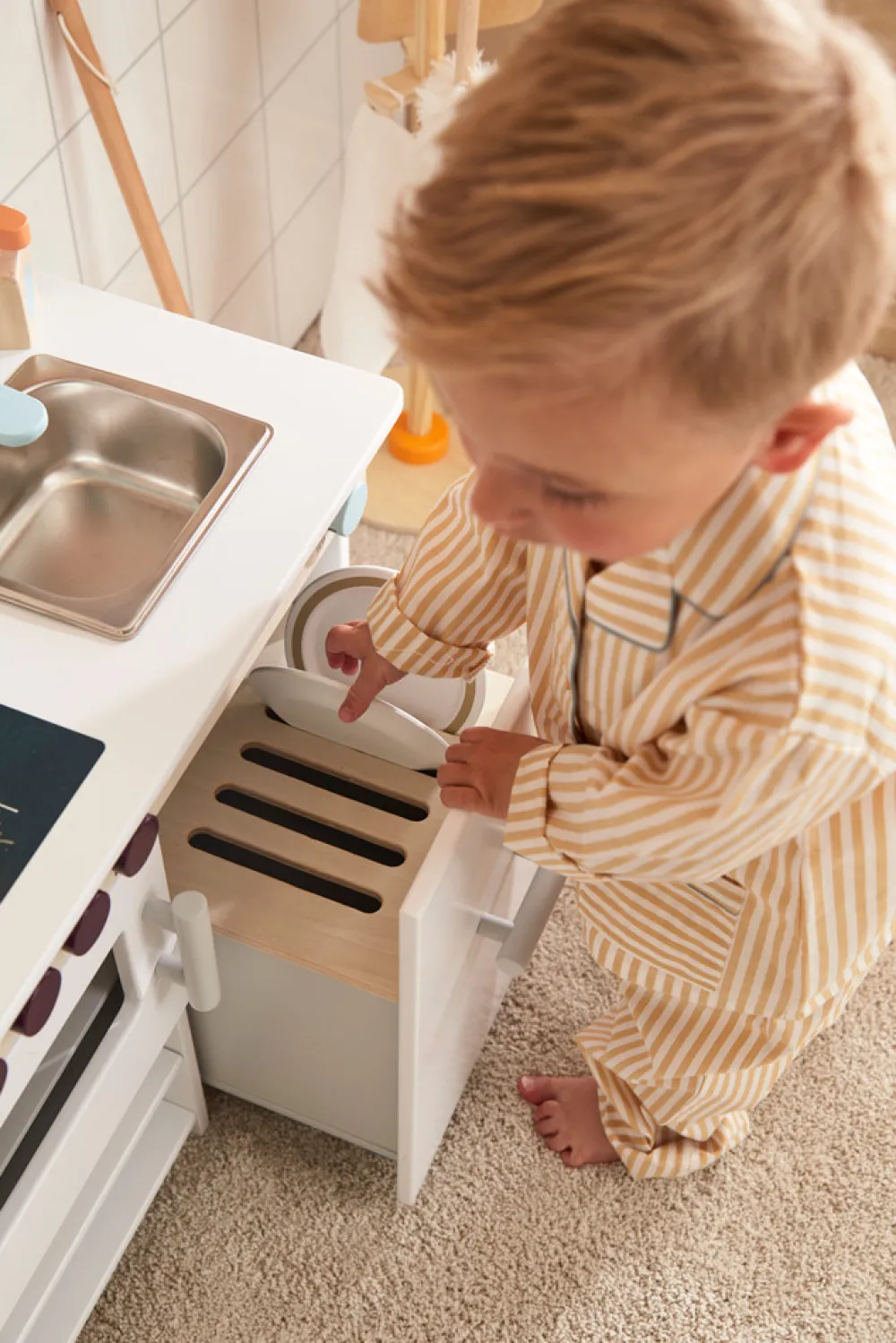 Dette moderne legekøkken i træ er fuldt udstyret med en opvaskemaskine, ovn, køkkenvask, hylder og en integreret emhætte. For at bruge det skal du placere tallerkener og bestik i opvaskemaskinen og lægge en tablet i åbningen foran. Drej på den klikkende knap, og du er klar til leg. Der er også en opvaskebørste og pumpeflydende sæbe til eventuelle svære pletter. På siden finder du tre knopper, hvor du kan hænge dit viskestykke. Når legen er færdig, kan opvaskemaskinen og hylderne under ovnen også bruges som praktisk opbevaring.