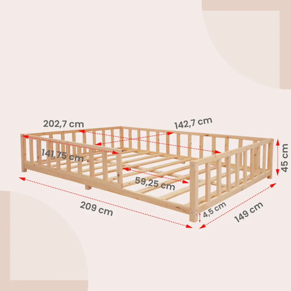 Kukka gulvsengen er fremstillet i overensstemmelse med Montessori-principperne, som har til formål at fremme barnets selvstændighed og læring fra en tidlig alder. Sengen har et rummeligt soveområde, der måler 140 x 200 cm, hvilket giver rigelig plads til at sove, lege og dele godnathistorier med forældrene. Den har robuste lameller og omfattende faldsikring på alle sider, hvilket sikrer et trygt sovemiljø. Fremstillet af massivt fyrretræ, garanterer sengen holdbarhed og kvalitet. Dens minimalistiske og tidløse skandinaviske design gør Kukka gulvsengen til en charmerende tilføjelse til ethvert børneværelse. Placeret lavt til jorden fremmer den selvstændighed, da børn nemt kan komme op og ned af sengen uden at skulle have hjælp fra forældrene. Der er 14 cm. mellem lamellerne. Max 100 kg.