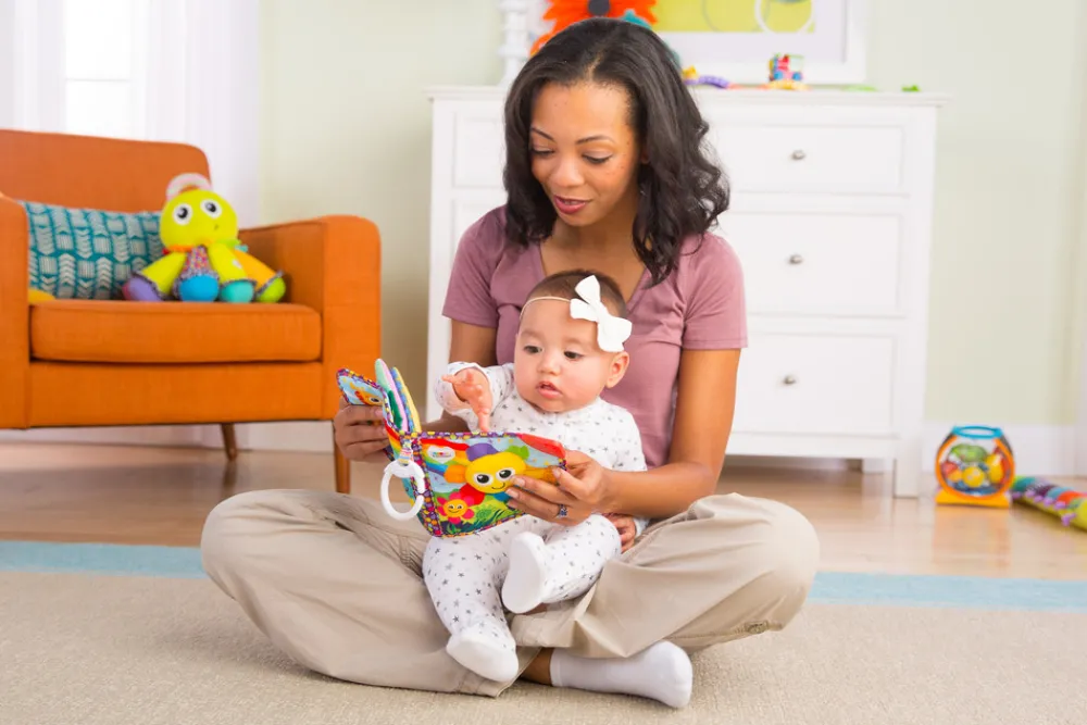 Bogen har bløde sider og indbygget pibelyd. Indeholder spejl, hjørner til at bide i, og forskellige strukturer til at udforske.