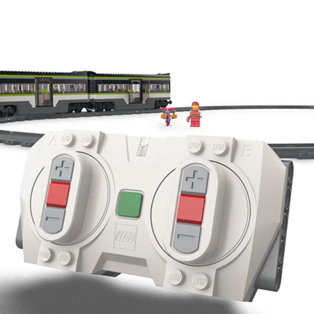LEGO® City sættet Eksprestog (60337) indeholder et fjernstyret ekspreslokomotiv med fungerende forlygter, der kan dæmpes, LEGO Powered Up-teknologi, spisevogn, passagervogn, perron, 24 sporstykker og 6 minifigurer til timevis af rolleleg med togtema