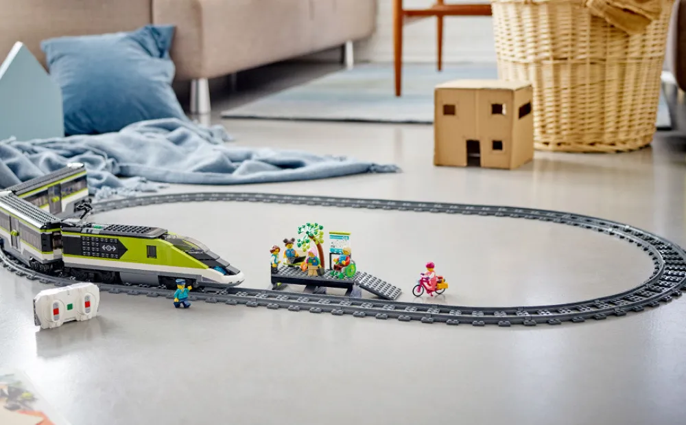 Her kommer det lynhurtige Eksprestog 60337 med forlygter, der lyser, når det ankommer til perronen. Tjek det ultramoderne aerodynamiske lokomotiv. Gå ind i spisevognen, og få noget at drikke og en croissant på rejsen, eller besøg passagervognen, hvor der er plads til din bagage og din cykel. Når du er ombord, kan du sætte dig ved dit foretrukne bord, læne dig tilbage og nyde turen!