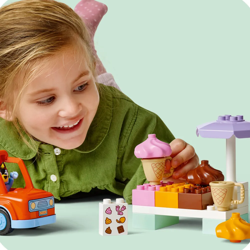 Gaven til tumlinger rummer timevis af familiesjov. De små kan køre legetøjsbilen – med plads til både figuren af far og Bluey – hen for at købe is. Det kreative legetøj giver de mindste mulighed for at udleve spændingen ved at tage til et særligt sted samt tilfredsstillelsen ved at få noget lækkert.