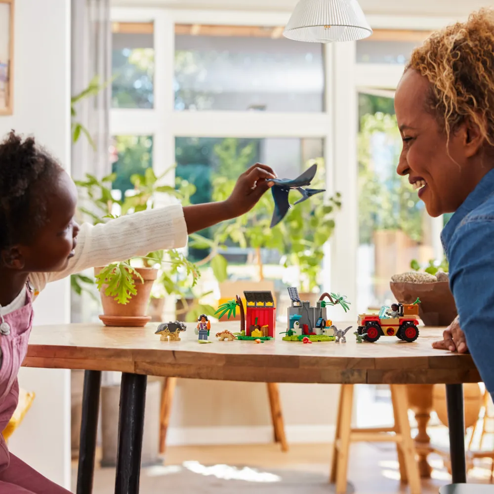 Hjælp Darius og Sammy med at fodre og pleje dinosaurerne på internatet 76963. Kør offroaderen hen til internatet, og læs kassen af. Sæt maden ved skuret, så de små dinosaurer kan finde den. Åh nej – den store pteranodon stjal fisken! Se ungerne spise og lege lidt. Se… Det er et nyt æg! Snart kommer der en ny dinosaurunge.