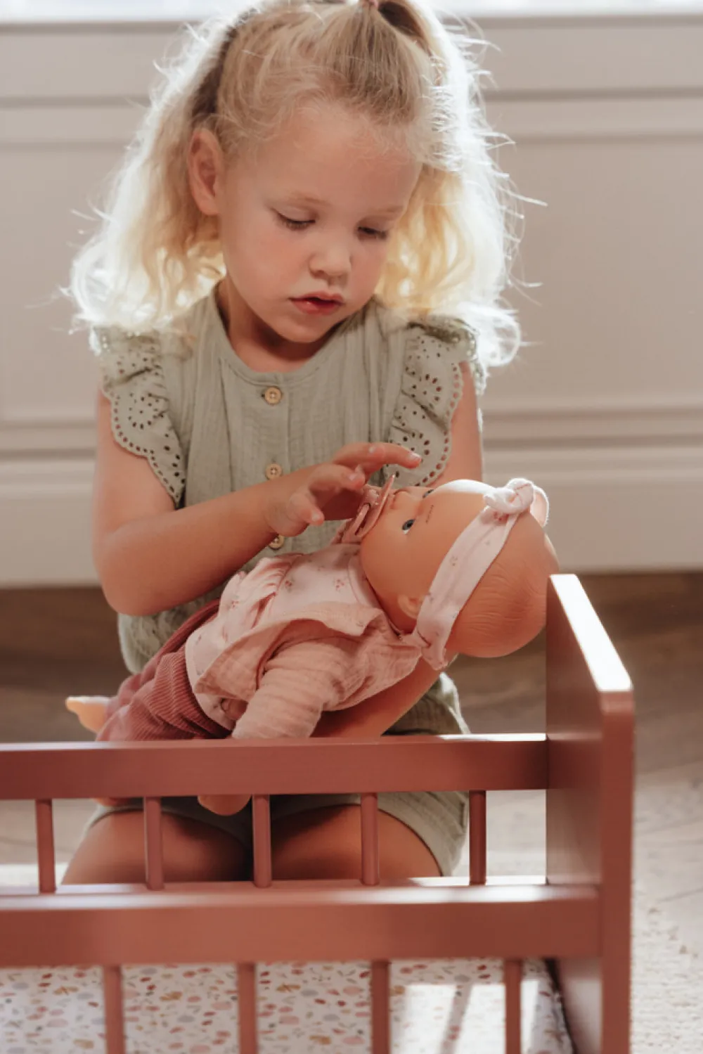 Mød baby Lily. Giv hende et kram og pas på hende. Lily er en yndig og livagtig dukke med en blød og nuttet krop, som elsker at blive elsket. Du kan skifte hendes tøj, hjælpe hende med at falde i søvn og berolige hende med sutten. Når hun er sulten, kan du tilbyde hende mælk af sutteflasken. Børn elsker at efterligne alt, hvad deres forældre gør, og denne babydukke vil inspirere dit barn til at deltage i rollelege om pleje og omsorg. Lily har hårbånd, langærmet kjole og lyserøde bukser med ribkant. At skifte hendes tøj fremmer finmotorikken og sutten og sutteflasken tilføjer et element af interaktiv leg.