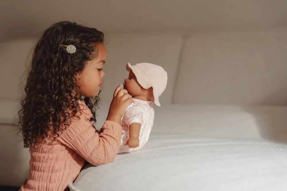 Hvad skal din Babydukke have på i dag? Dette dejlige sæt er perfekt til enhver lejlighed. Nyd at klæde din yndlingsdukke på til en dag fyldt med leg og eventyr. Sættet består af en fin kortærmet heldragt i en blød og fortryllende lyserød nuance, prydet med fine små blomster. For at fuldende dette charmerende sæt kommer også en sød solhat. Passer til 36 cm. dukke