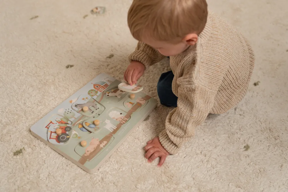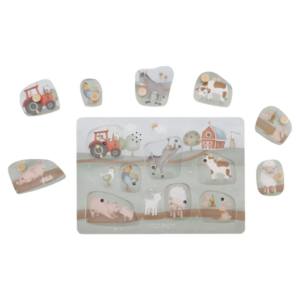 Lær alle dyrene på bondegården at kende. Genkend deres former og unikke lyde med dette sjove puslespil. Når du placerer dyret tilbage på den rigtige plads, vil du høre en matchende lyd. Dette puslespil med 7 dyr og en lydgivende traktor fremmer øje-hånd-koordination og stimulerer dit barns ordforråd.Sensorerne reagerer, når puslespilsbrikken placeres tilbage. Puslespillet har lysaktiverede sensorer – brug det i godt lys for de bedste resultater. Sørg for, at knappen er “ON” for at aktivere lydfunktionen. Sensorerne kan utilsigtet aktiveres af direkte sollys, så sluk altid for dem, når de ikke er i brug. (Batterier (2 x AAA) medfølger ikke.)
