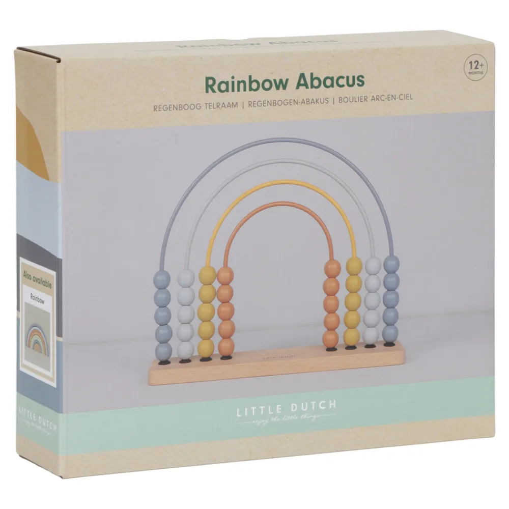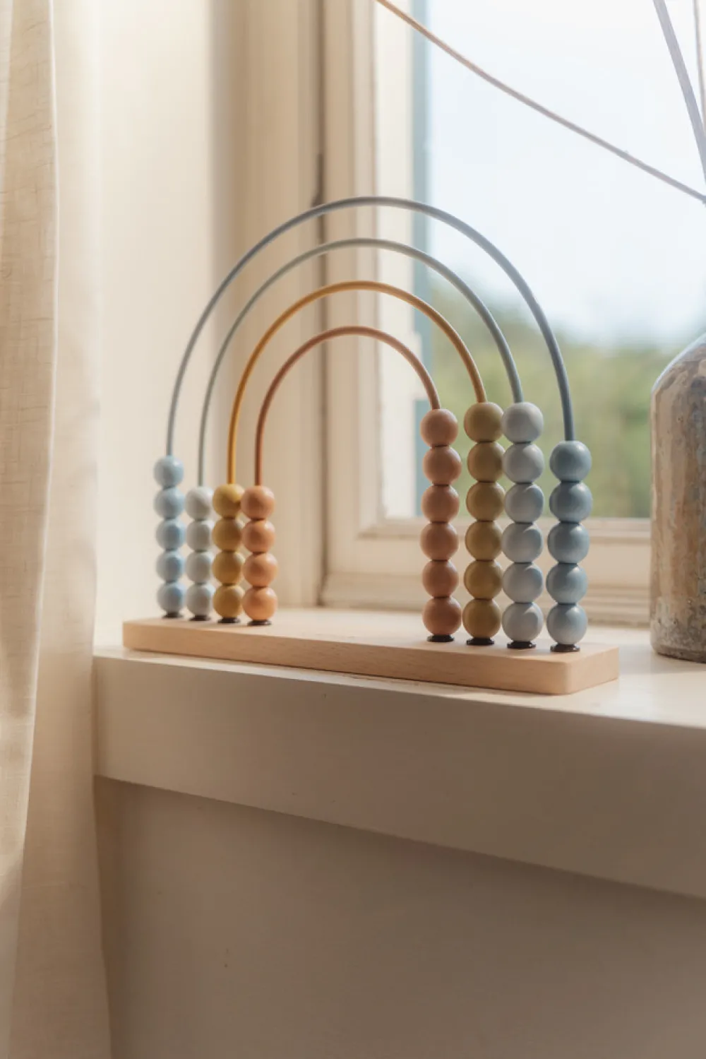 Tæl fra 1 til 10 i alle regnbuens farver! Denne yndige regnbueformede kugleramme er en dejlig måde at gøre det sjovt at tælle på. Skub de farverige perler fra den ene side til den anden, og udforsk de forskellige nuancer af blå, gul og brun. Når det lille barn leger og udvikler en grundlæggende forståelse for at tælle, trænes også finmotorikken. Større børn kan øve sig i matematik ved at lave tælleøvelser. En fantastisk måde at lege og lære på samme tid!