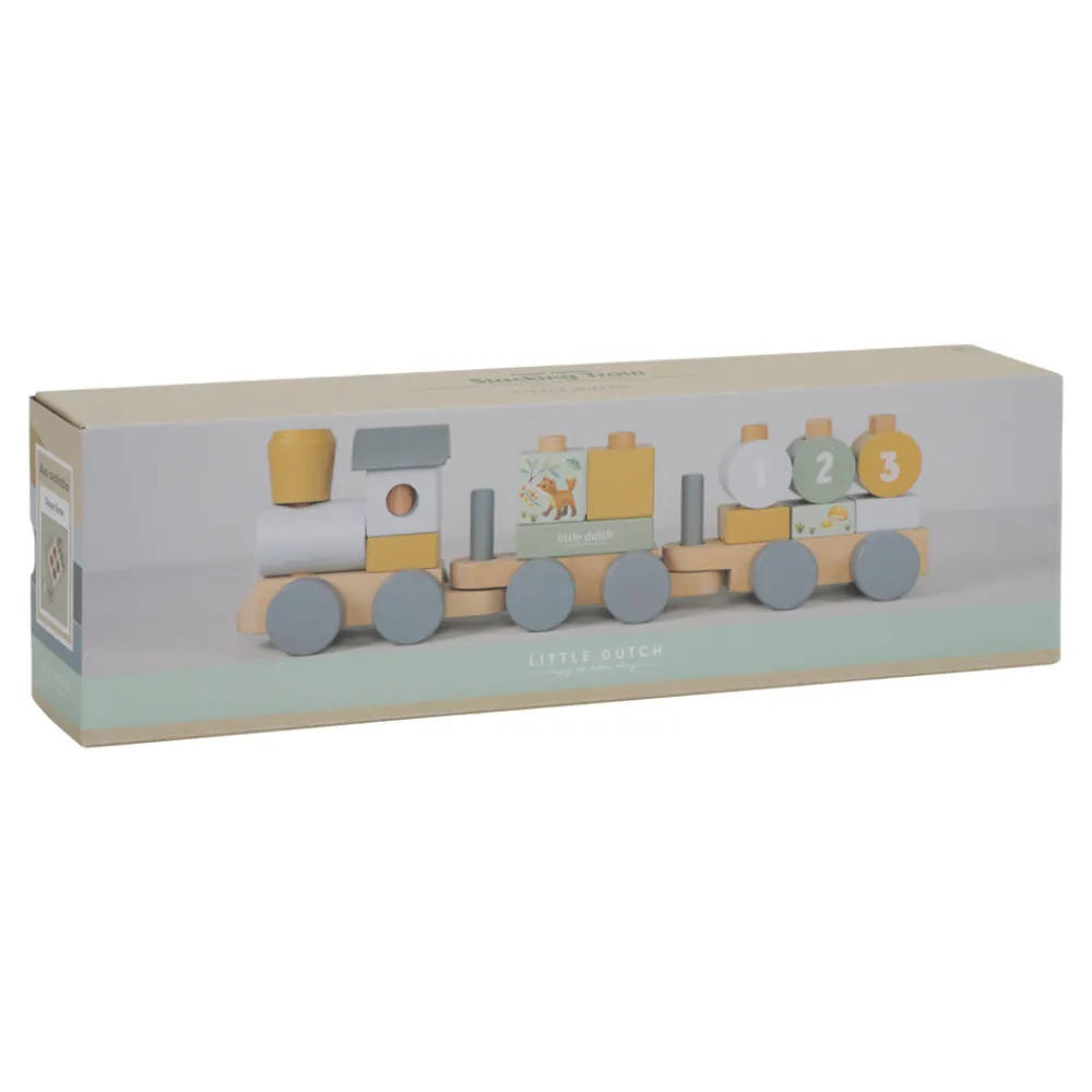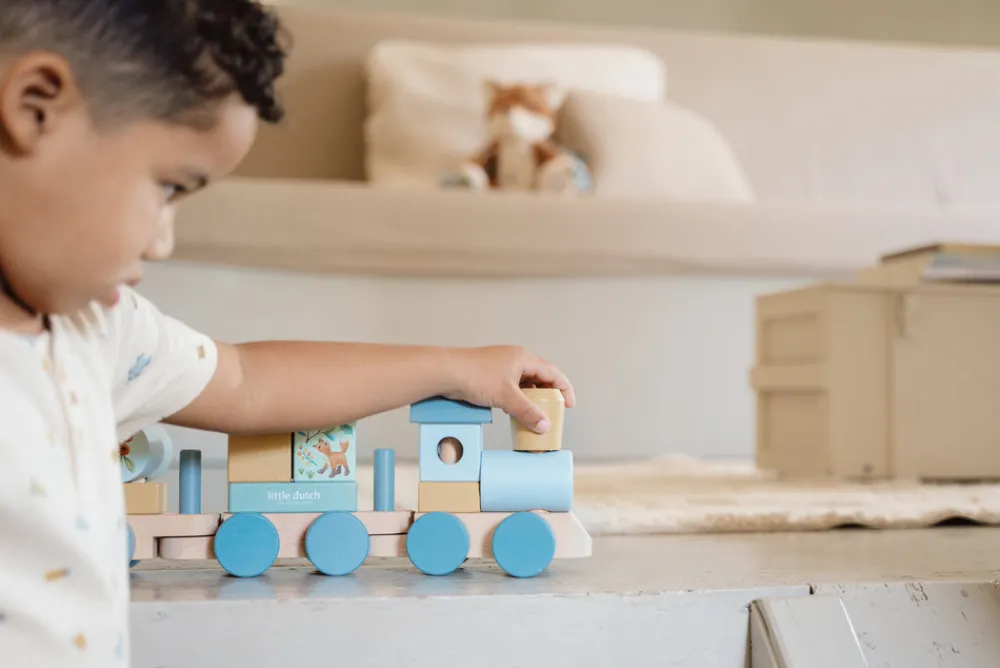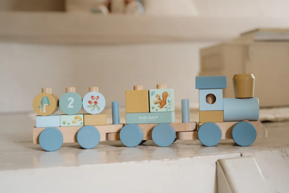 Fut Fut! Stable klodserne en efter en og skabe de tre vogne i dette smukke trætog. Med Illustrationer fra Forest Friends og tallene 1, 2 og 3 på klodserne. En sjov måde at lege på og udvikle hånd-øje-koordination på samme tid. Toget består af 17 dele og er ca. 45 cm langt.