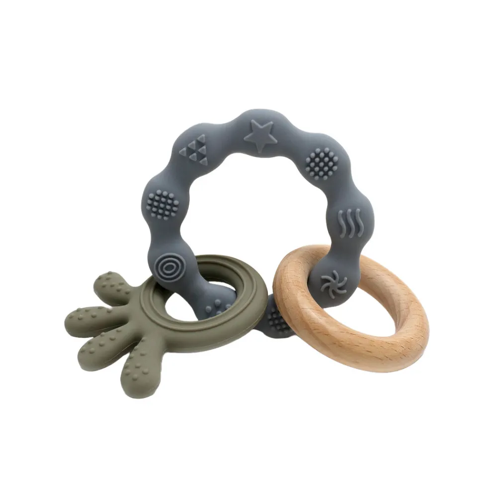 Bideranglen har forskellige konturer og blødhed som gør det behageligt for barnet at bide i og lege med.