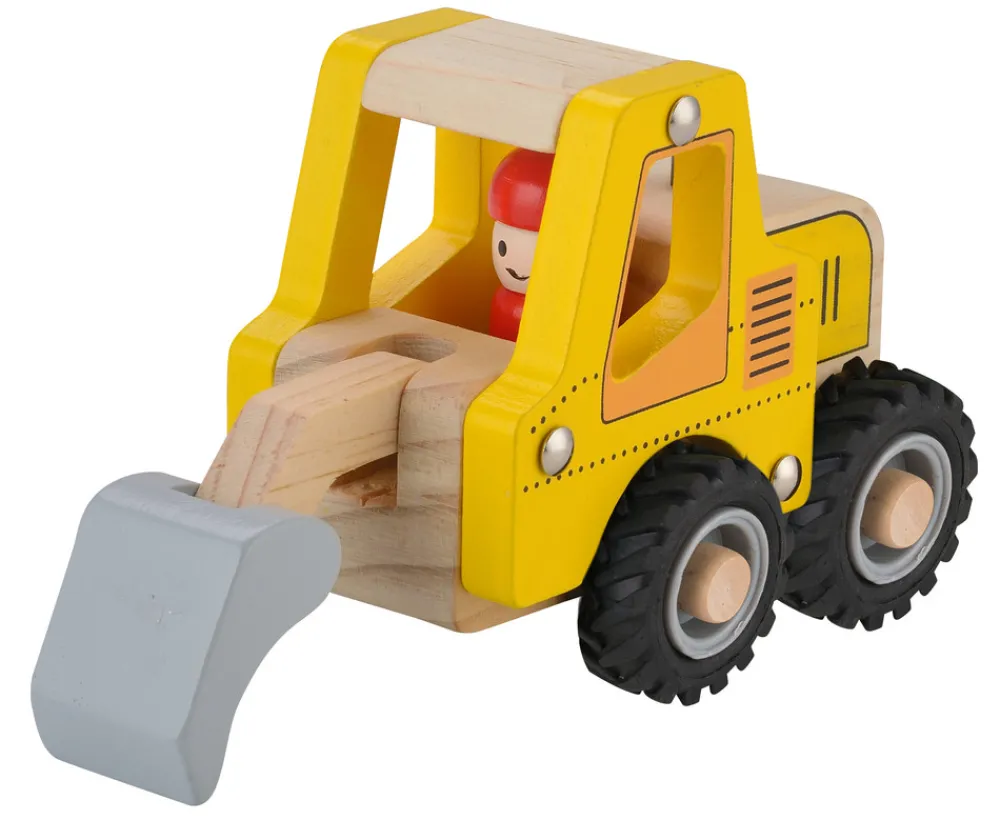 Gravemaskine i træ med gummihjul. I bilen sidder en træfigur.