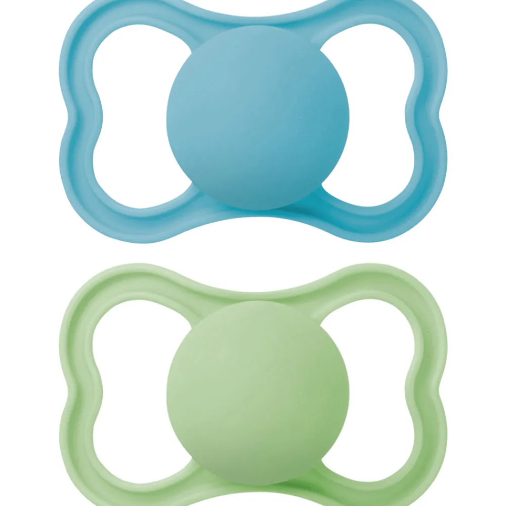 MAM Air har en flad, symmetrisk sut og ekstra store lufthuller, så barnets følsomme hud kan ånde. Det specielle design gør også, at forældrene kan se barnets smil, selv når sutten er i brug. Sugedelen er lavet af silkeblød silikone, MAMSkinSoftTM-silikone som føles blød og velkendt, ligesom mors hud, og som accepteres af 94% af alle babyer*. Sutterne leveres i en praktisk opbevarings- og steriliseringsæske, der gør det nemt at sterilisere sutterne i mikrobølgeovnen.