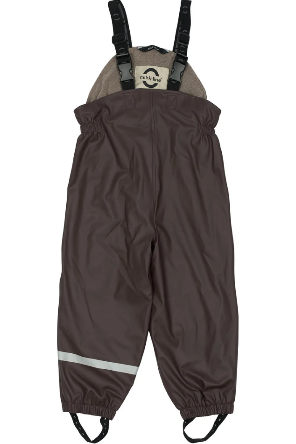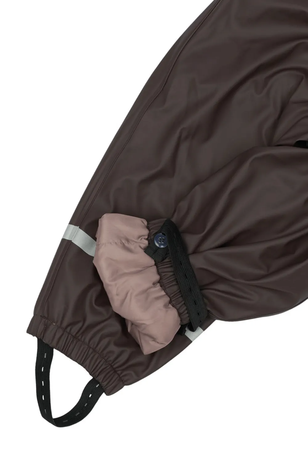 Fra str. 86 til 104 har regnbukserne smæk, så de også dækker mave og ryg. Bukserne har også justerbare seler, der lukkes med klikspænder.