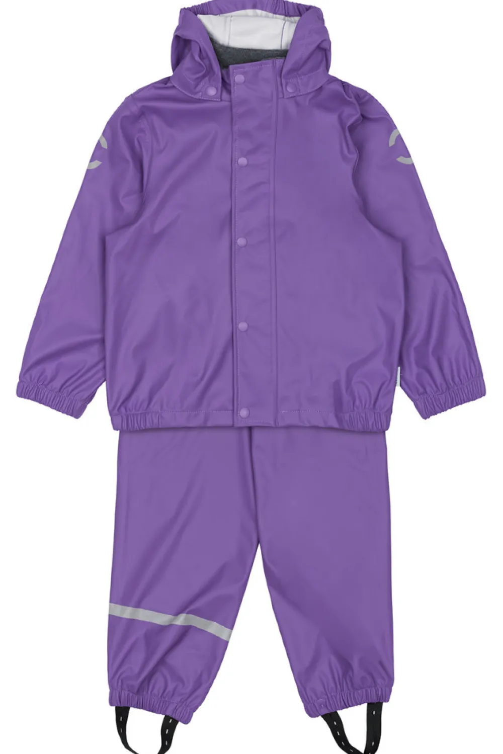 Praktisk og funktionelt recycled regnsæt fra mikk-line, der holder dit barn tørt. Regntøjet er udstyret med refleksdetaljer så dit barn kan færdes sikkert i mørket. Regnsættet er naturligvis både vand- og vindtæt. Sømmene er svejsede, hvilket forhindrer vand i at trænge igennem samlingerne. Buksen har fodstropper, som holder buksen under gummistøvlen. Regnbukserne har justerbare seler, tætsiddende elastik i taljen og et ekstra stykke stof der dækker både foran og bagpå kroppen.