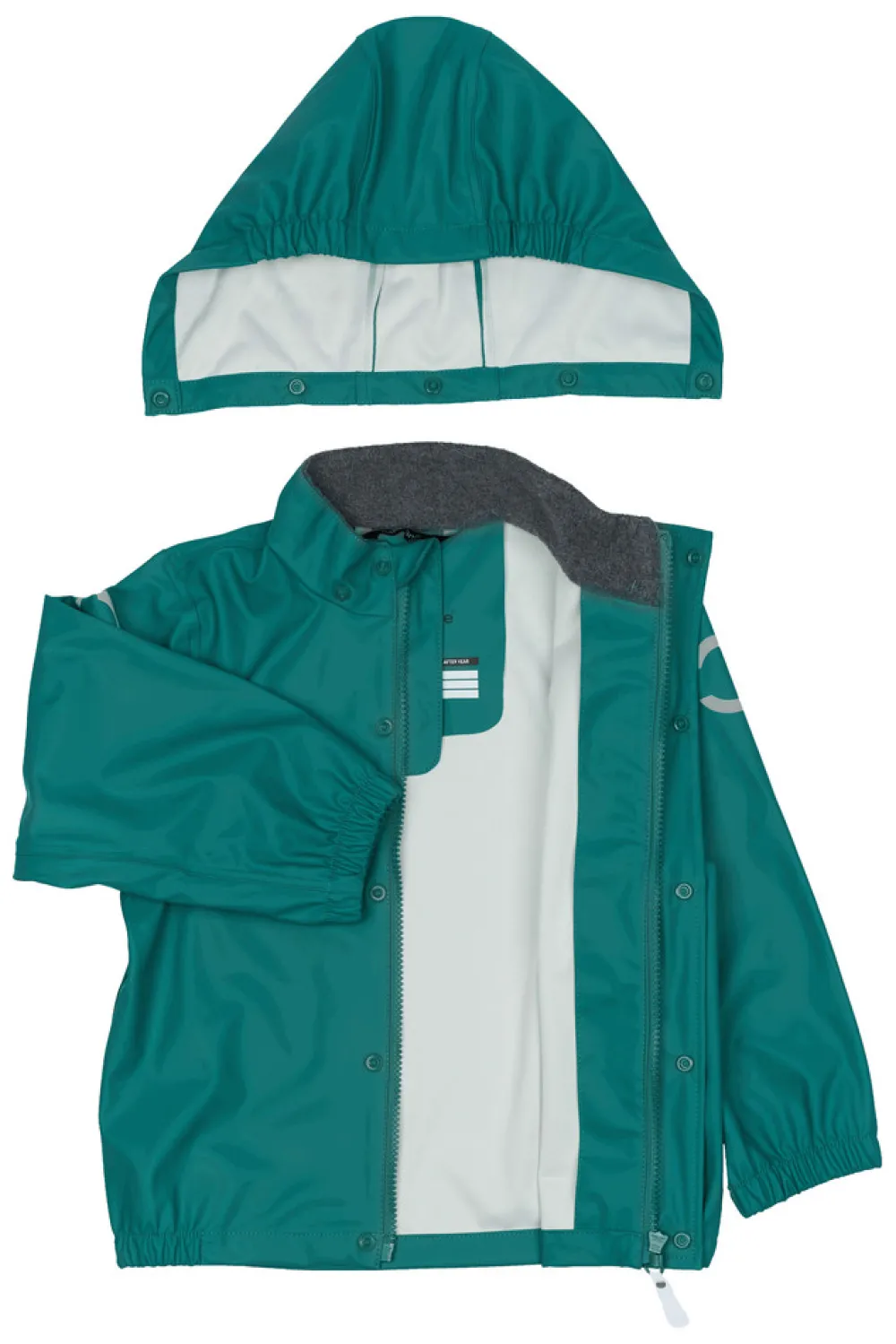 Praktisk og funktionelt recycled regnsæt fra mikk-line, der holder dit barn tørt. Regntøjet er udstyret med refleksdetaljer så dit barn kan færdes sikkert i mørket. Regnsættet er naturligvis både vand- og vindtæt. Sømmene er svejsede, hvilket forhindrer vand i at trænge igennem samlingerne. Buksen har fodstropper, som holder buksen under gummistøvlen. Regnbukserne har justerbare seler, tætsiddende elastik i taljen og et ekstra stykke stof der dækker både foran og bagpå kroppen.
