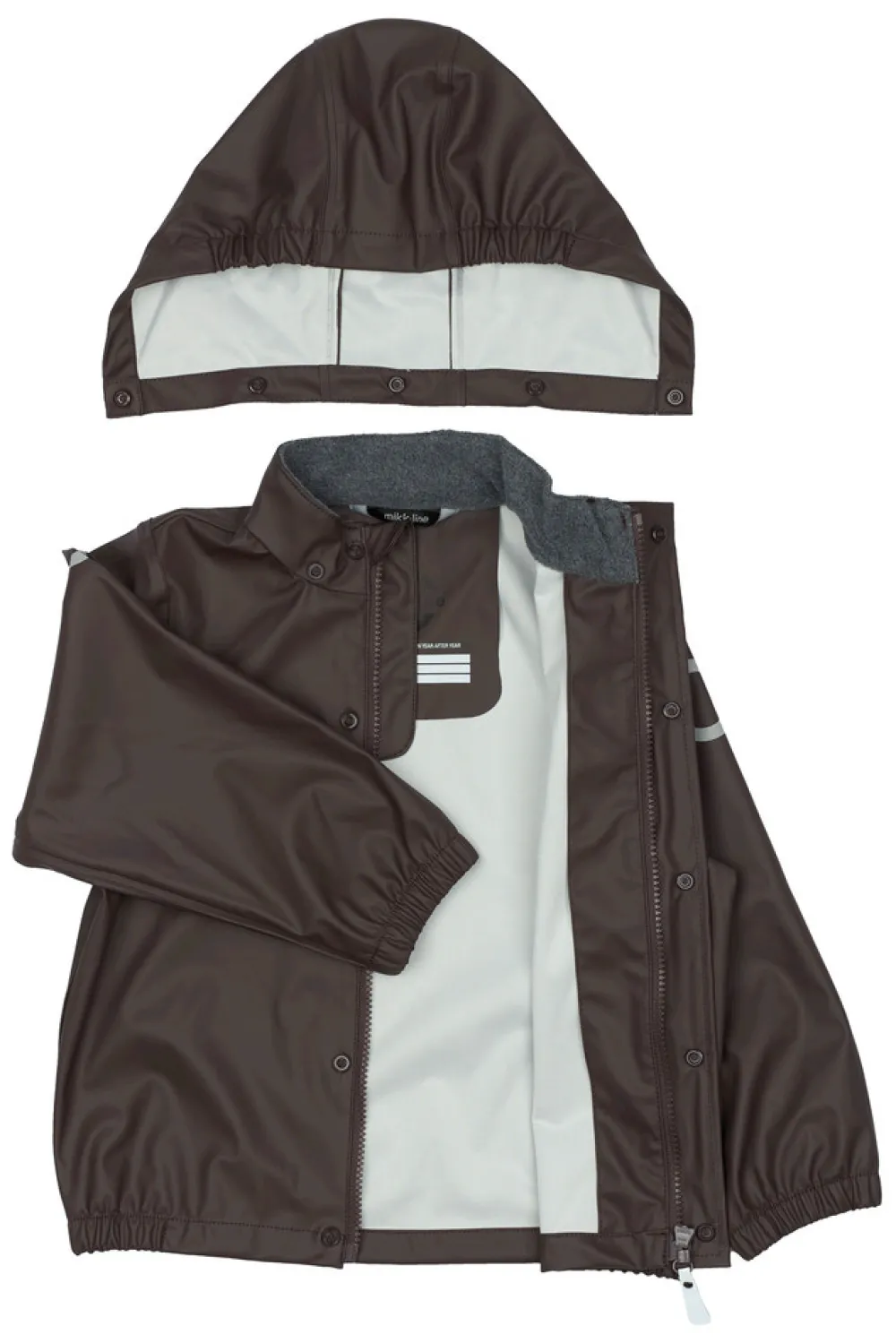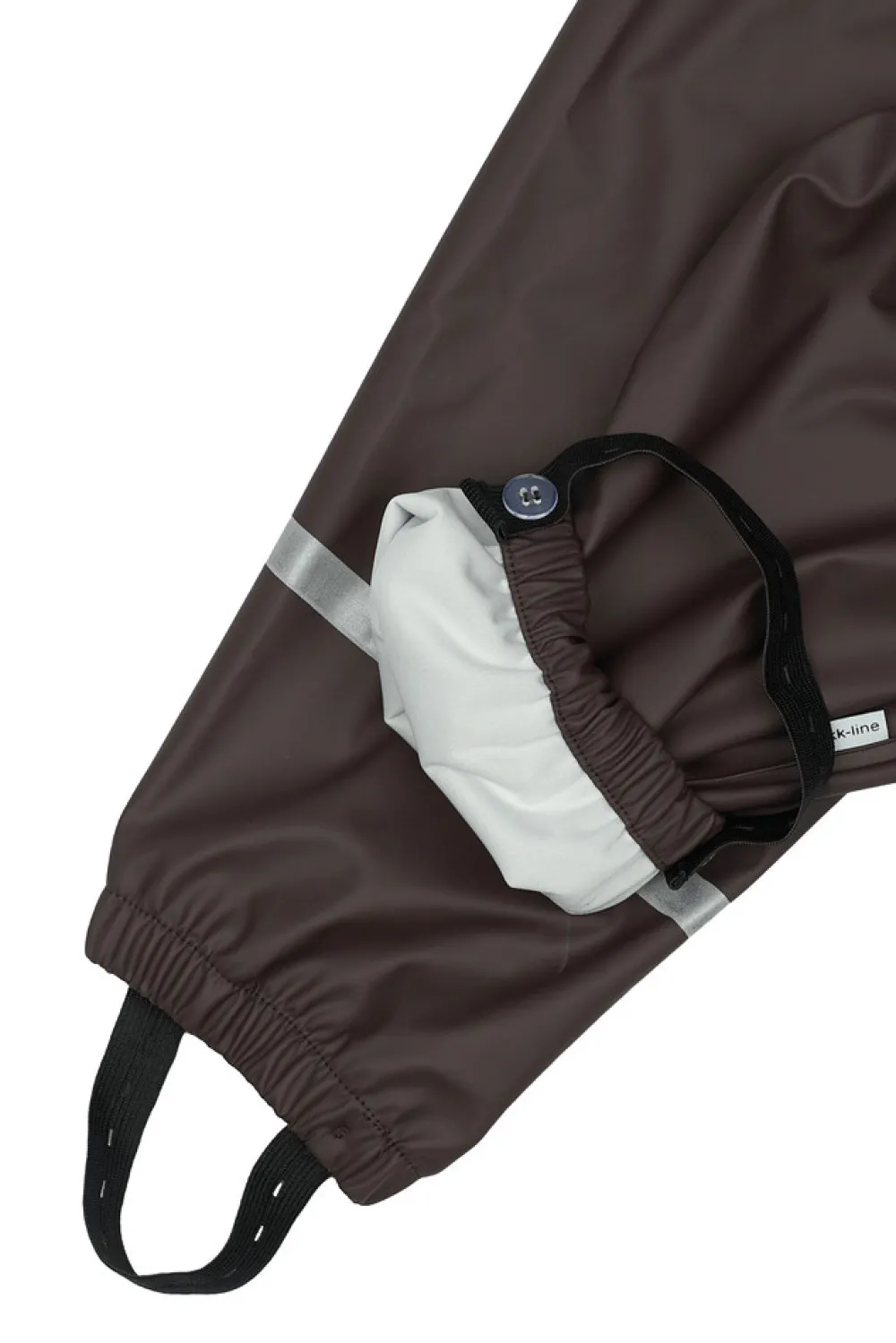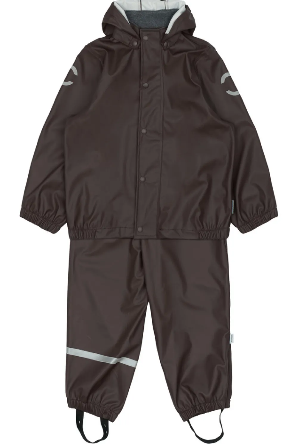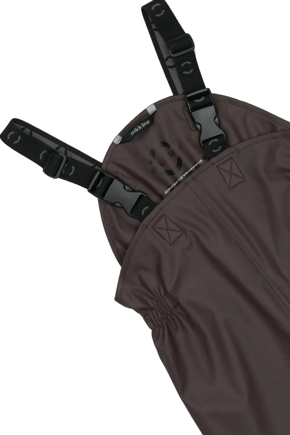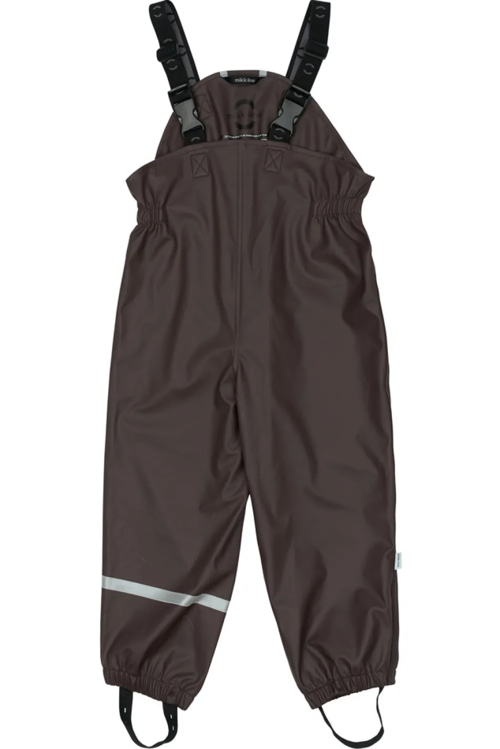 Praktisk og funktionelt recycled regnsæt fra mikk-line, der holder dit barn tørt. Regntøjet er udstyret med refleksdetaljer så dit barn kan færdes sikkert i mørket. Regnsættet er naturligvis både vand- og vindtæt. Sømmene er svejsede, hvilket forhindrer vand i at trænge igennem samlingerne. Buksen har fodstropper, som holder buksen under gummistøvlen. Regnbukserne har justerbare seler, tætsiddende elastik i taljen og et ekstra stykke stof der dækker både foran og bagpå kroppen.