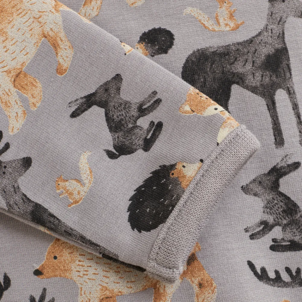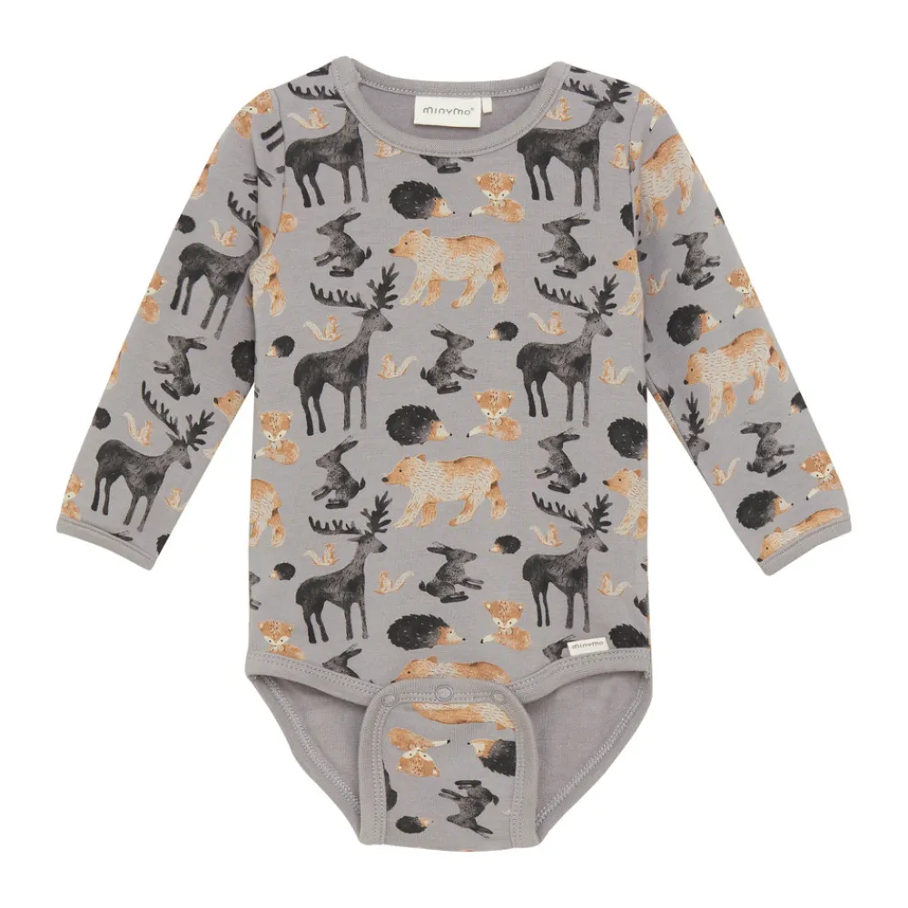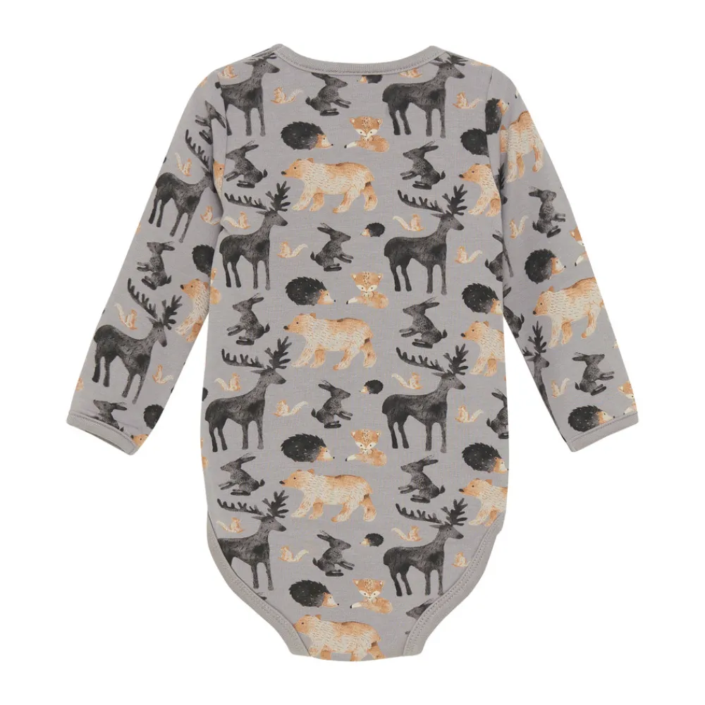 Langærmet body i blødt sweatmateriale med all-over print. Denne komfortable body er fremstillet i et blødt sweatstof, der føles dejligt mod barnets hud. Den er designet med praktiske trykknapper mellem benene, som gør påklædning og bleskift nemt og hurtigt.