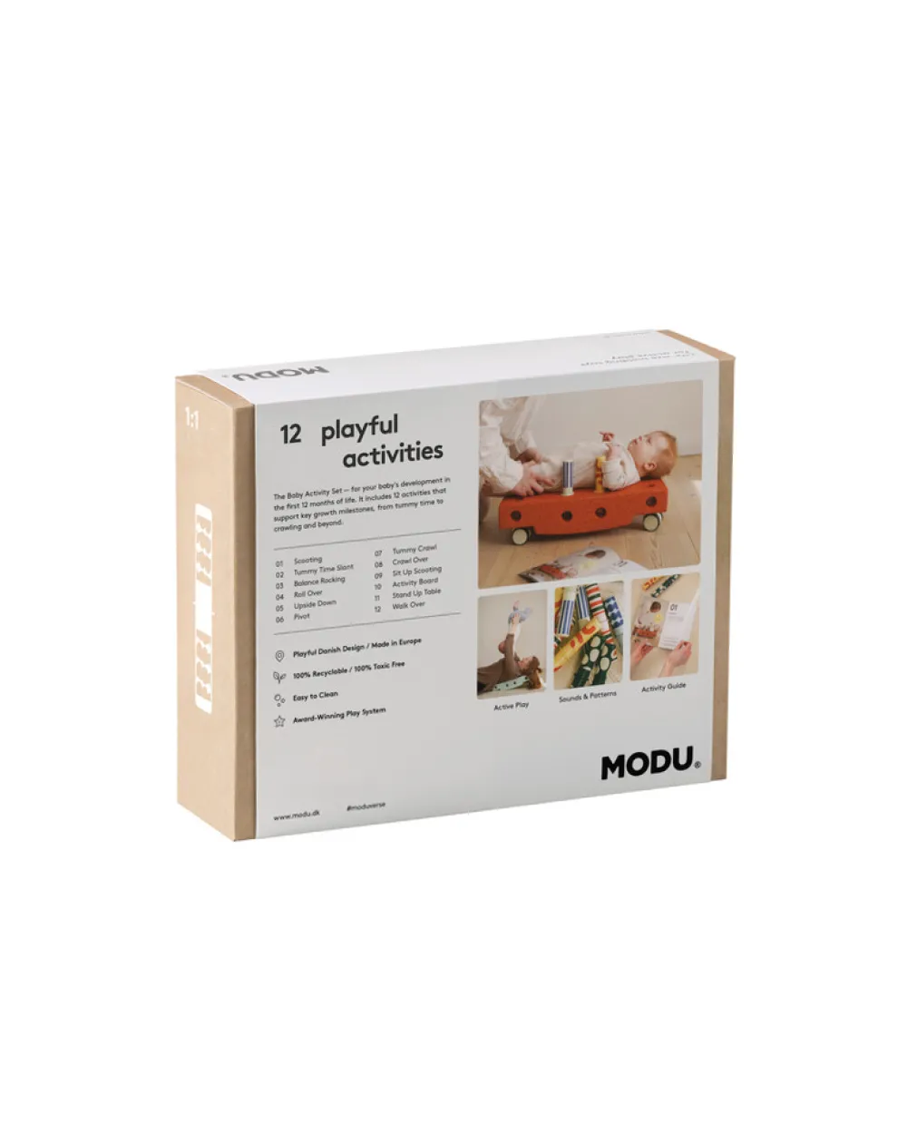 MODU baby motoriksæt — 12 sjove øvelser til de første 12 måneder af livet. Produktet er designet af eksperter i babyudvikling og indeholder en omfattende guide med billeder og vejledninger, der følger din babys vigtige motoriske milepæle; fra mavetid til kravl og videre. I pakken modtager du også specielt designet raslepinde med unikke lyde og mønstre, som giver både visuel og sanselig stimulans. Velkommen til et år fyldt med sjov, leg og udvikling!
