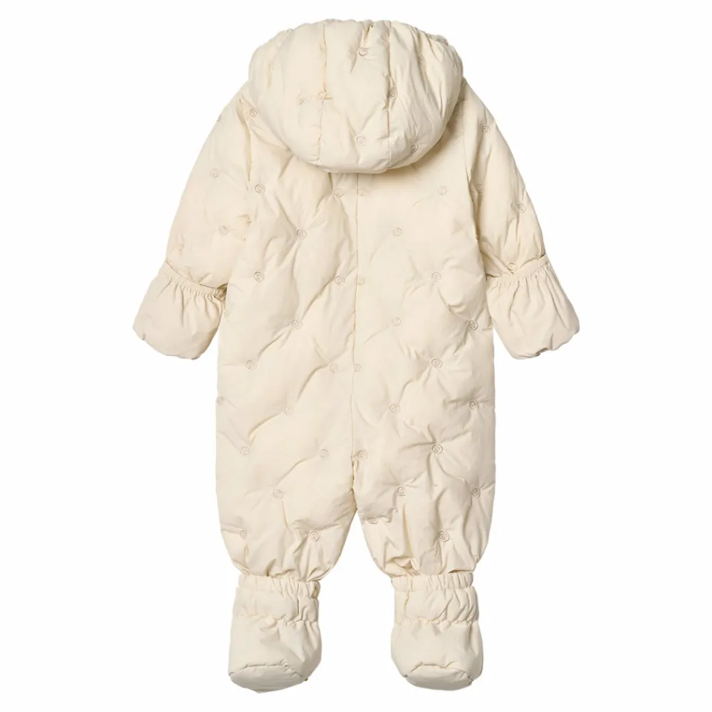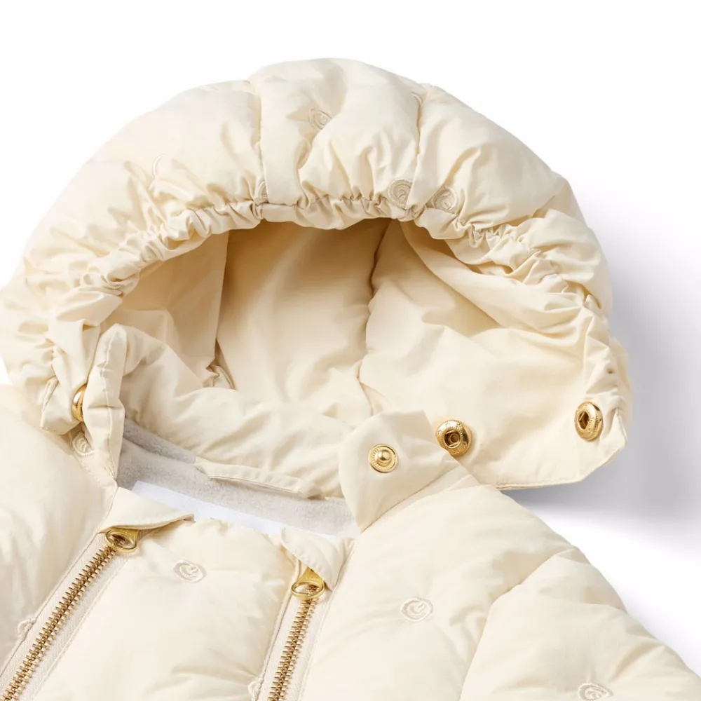 Dragten er foret med blød fleece og har elastik ved ærme- og benåbninger, som hjælper med at holde vanter, sokker og støvler på plads – samtidig med at den beskytter mod vind og vejr. Fyldet er lavet af genanvendt polyester, som giver en jævn, blød varmeisolering. Overfladen er vandafvisende og fri for skadelige stoffer som PFOS og PFOA.