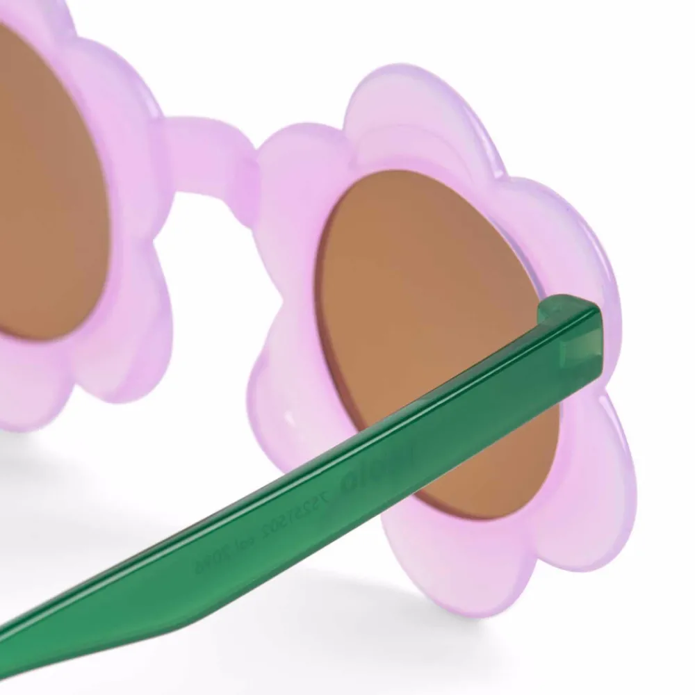 Blomsterformede solbriller i lyserød og grøn med tonede glas og en satineret overflade, der giver 100% UV-beskyttelse. Velegnet til børn og unge i alderen 7 til 16 år.