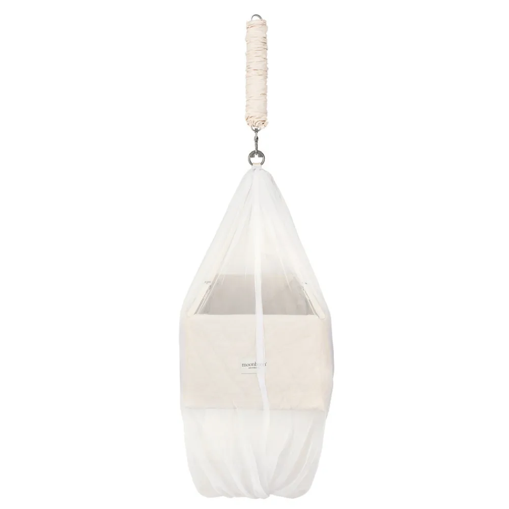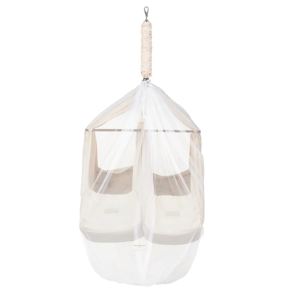 Moonboons myggenet med snørelukning i toppen beskytter dit barn mod fluer og myg i de varme måneder og sikrer maksimal luftgennemstrømning og komfort. De åndbare myggenet er nemme at montere. Myggenettene er fremstillet af 100 % polyester og har en overlappende åbning for hurtig adgang til slyngevuggen og barnet. I de varme måneder beskytter Moonboons myggenet i to størrelser dit barn mod fluer og myg. Myggenettene er fremstillet af 100 % åndbart polyester for at sikre maksimal luftgennemstrømning. De er nemme at montere og har en overlappende åbning for hurtig adgang til Slyngevuggen (lille størrelse), Vuggen eller Tvillingeslyngevuggen (stor størrelse) og dit barn. Nettene er udstyret med en praktisk snøre i toppen, så de let kan åbnes og lukkes uden at forstyrre dit barn. Myggenettenes knapsystem gør det nemt at fastgøre dem.