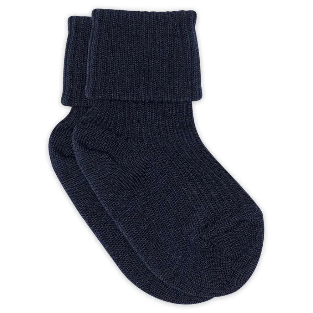 Klassisk ribbet babystrømpe i en blanding af uld og viskose-bambus fra mpKids. Sokkerne er strikket i uld, hvor viskose-bambusgarnet er strikket på indersiden, hvilket gør sokken blød mod babyens hud. For at sikre, at sokkerne har den bedst mulige pasform, har de en anatomisk korrekt hæl med en vinkel på 90° og en foldet kant ved anklen.