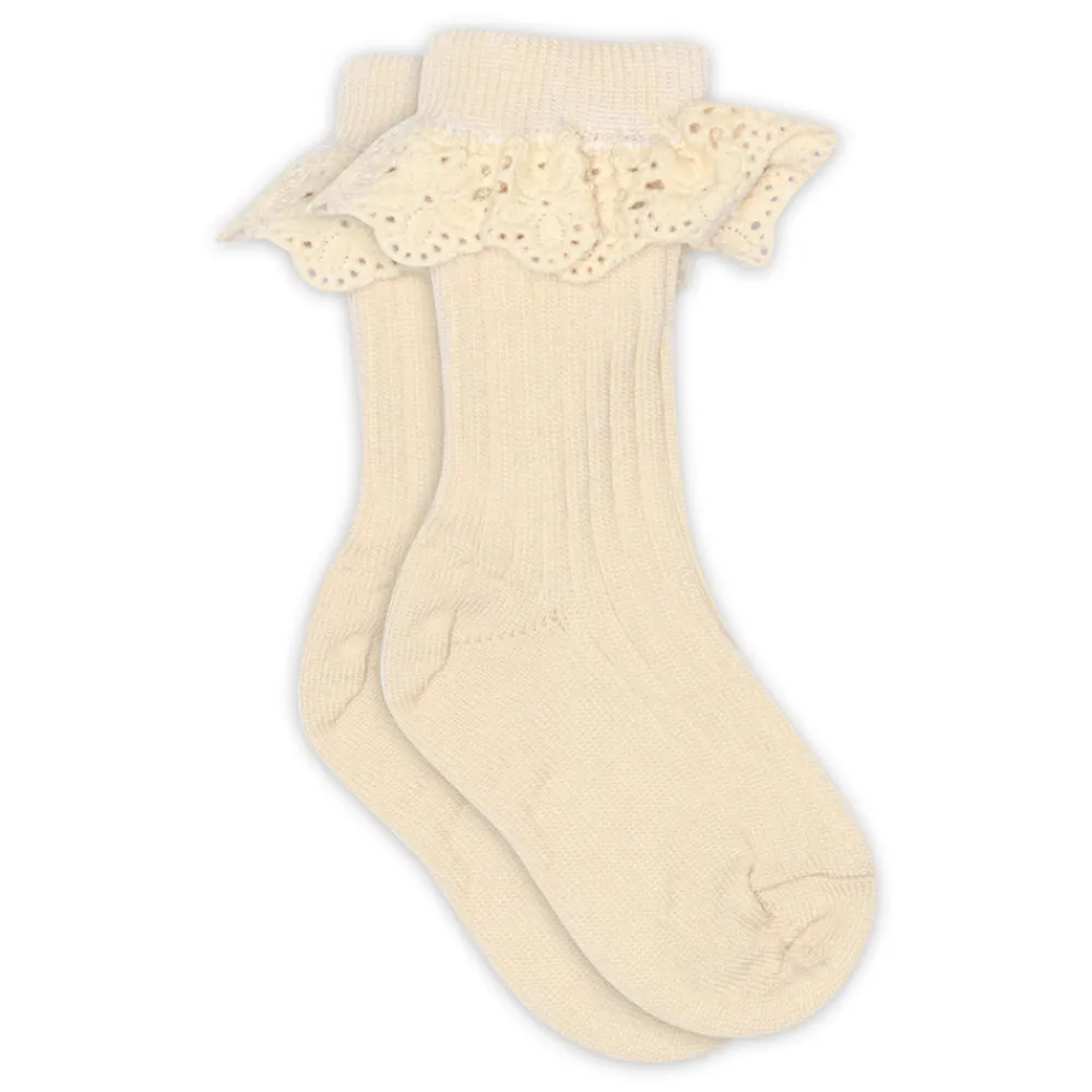 Børneuldstrømper fra mpKids. Sokkerne har en bred ribbet struktur og en elastisk ombukket kant, afsluttet med en delikat blondekant.