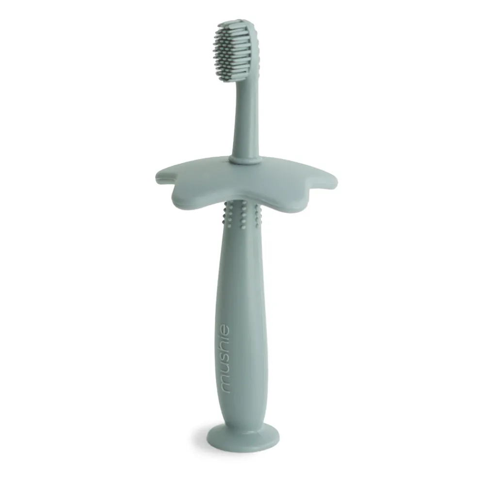 Introducér dit barn til tandbørstning og god mundhygiejne med denne flotte og praktiske tandbørste fra Mushie. Den vil blidt børste dit barns tænder og evt. ømme gummer. Tandbørsten er fremstillet i 100% fødevarekvalificeret silikone og derfor er den blød, behagelig og uden hårde kanter, der kan gøre ondt på babys sarte gummer. Tandbørsten har et aftageligt blomster- eller stjerneformet skjold, som sikrer, at tandbørsten ikke bliver skubbet ned i halsen på dit barn. Tandbørsten bør anvendes under opsyn.