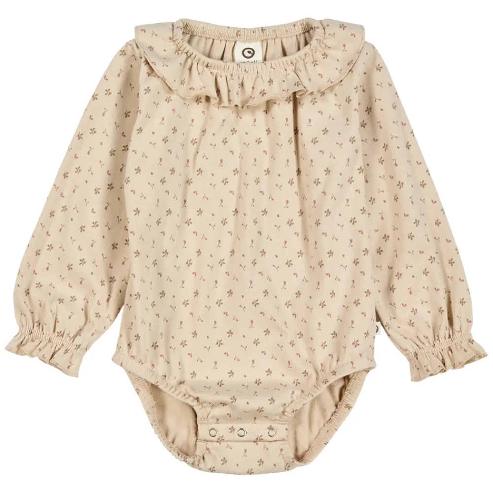 Denne skønne body er designet med lange ærmer og en fin, dekorativ flæsekrave, der giver et sødt og klassisk udtryk. Ærmerne afsluttes med elastik, som skaber en let rynkeeffekt og sikrer en god pasform. Halsåbningen har også elastik, hvilket gør den nem at få over hovedet, og bodyen lukkes praktisk med trykknapper i bunden.