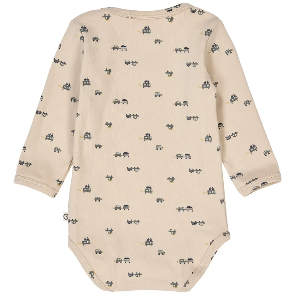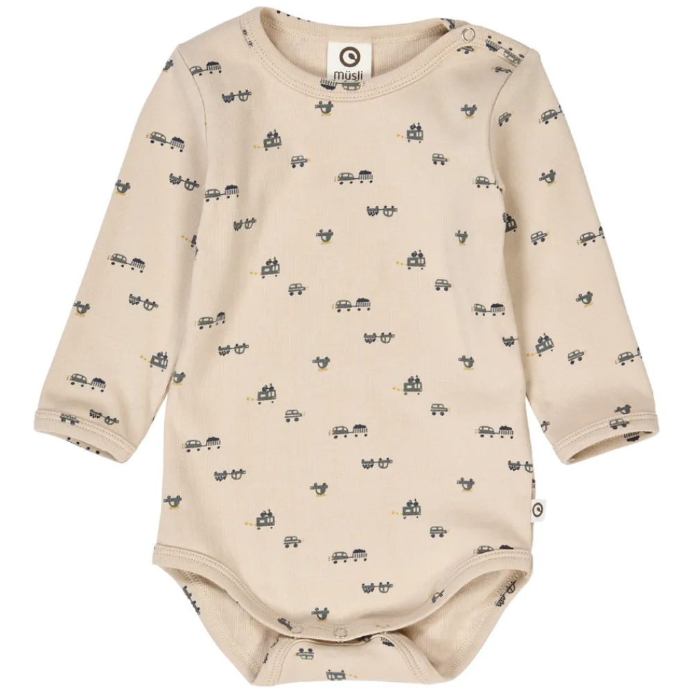 Denne søde body er dekoreret med et fint, gennemgående print af små biler – perfekt til de mindste med fart på. Den er lavet i en blød og strækbar 2×2 ribkvalitet med elastan, som sikrer en behagelig pasform og god bevægelsesfrihed.