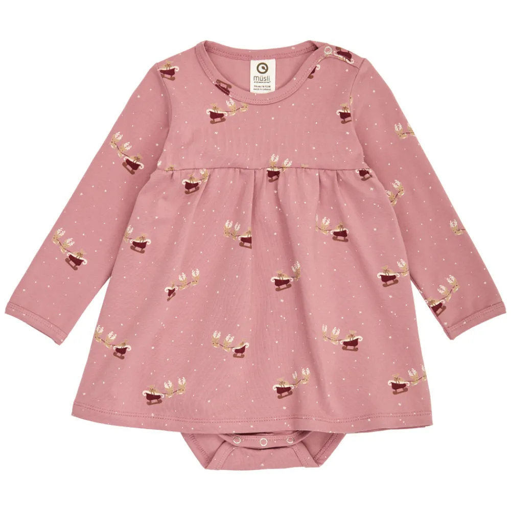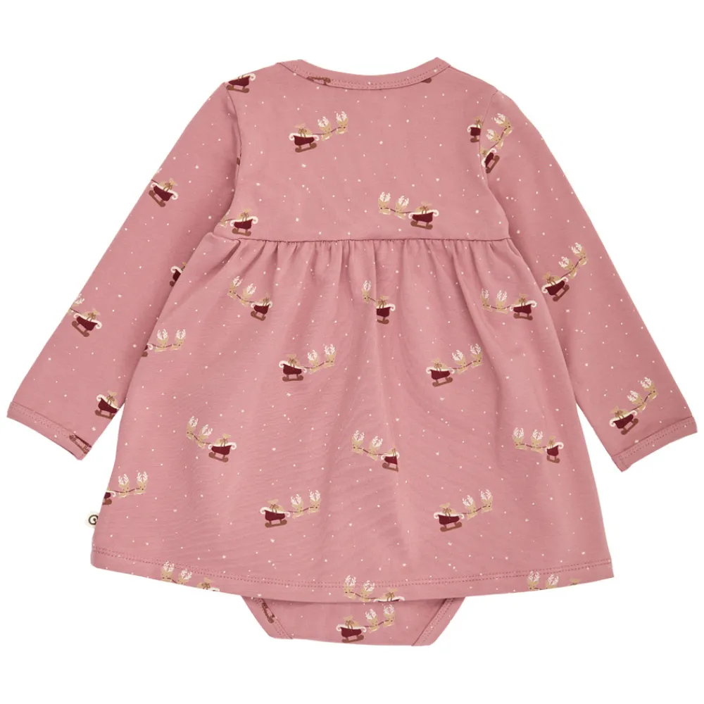 Denne søde og festlige kjolebody er pyntet med et charmerende juleprint med rensdyr og julemandens kane – perfekt til julens hyggelige stunder. Kjolebodyen åbnes nemt med trykknapper i halsudskæringen og forneden, hvilket gør den praktisk i hverdagen.