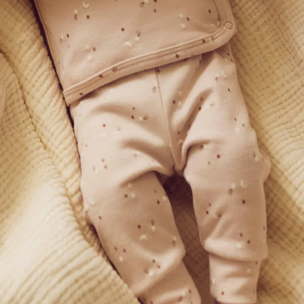 Dejlig bløde bukser i rib til de mindste. Smukt gennemgående print af stjerner. Bukserne har en bred og elastisk kant foroven som kan foldes efter behov og stil.