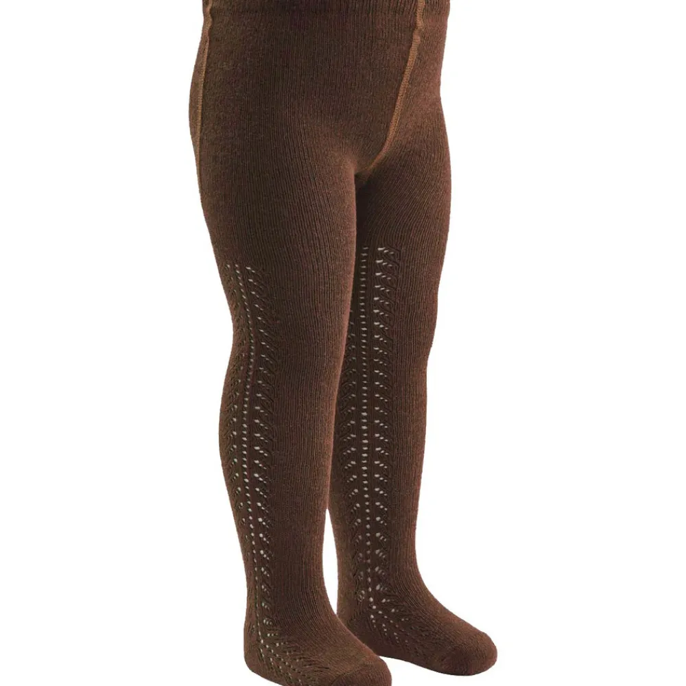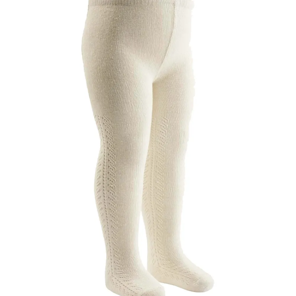 Søde og bløde strømpebukser med smukt hulmønster på benene. Perfekte under kjoler eller til bloomers. Blød kvalitet med forstærkede syninger i skridtet og plads til bleen. Disse strømpebukser er fremstillet af bomuld og genanvendt polyester fibre.