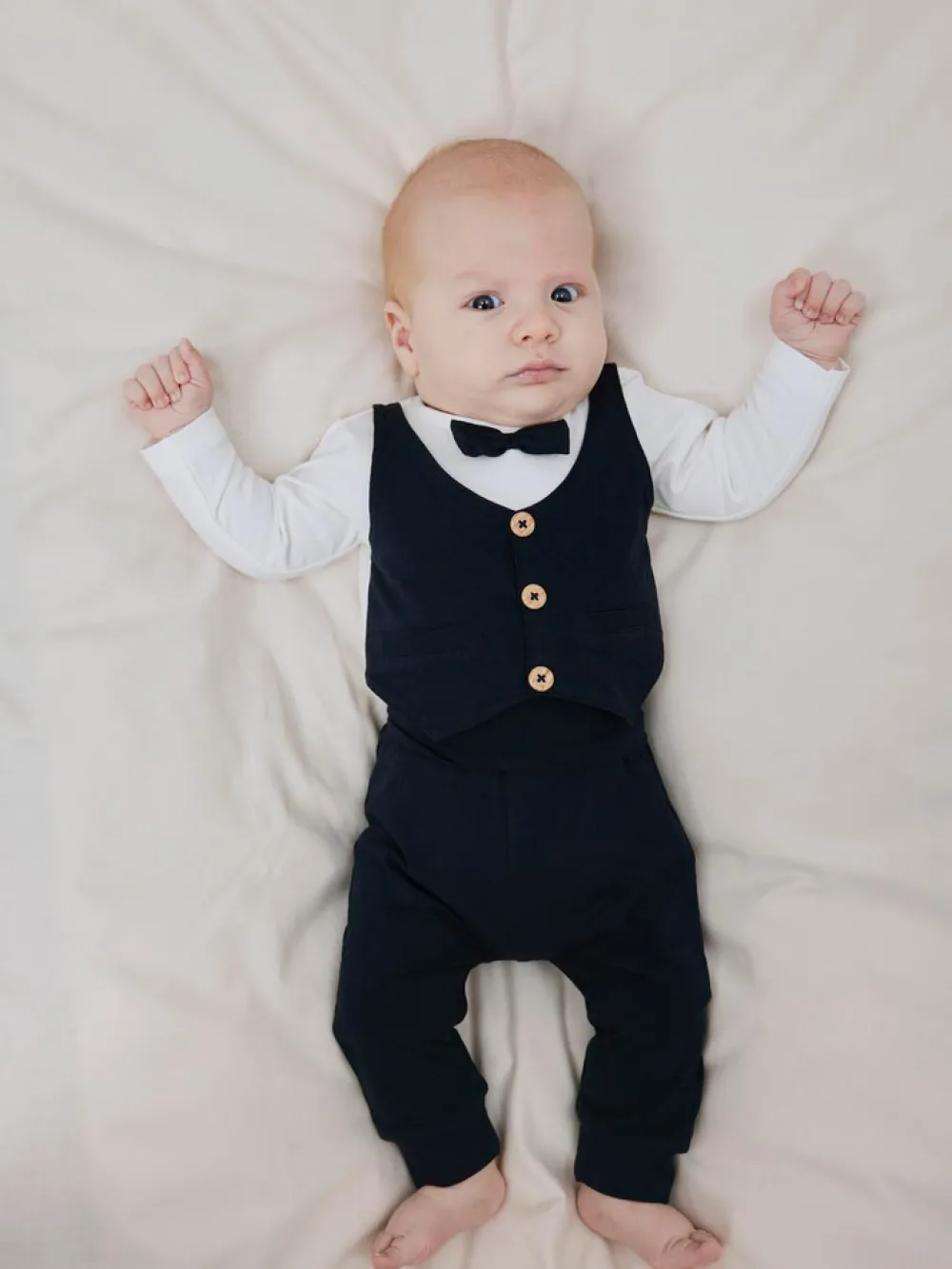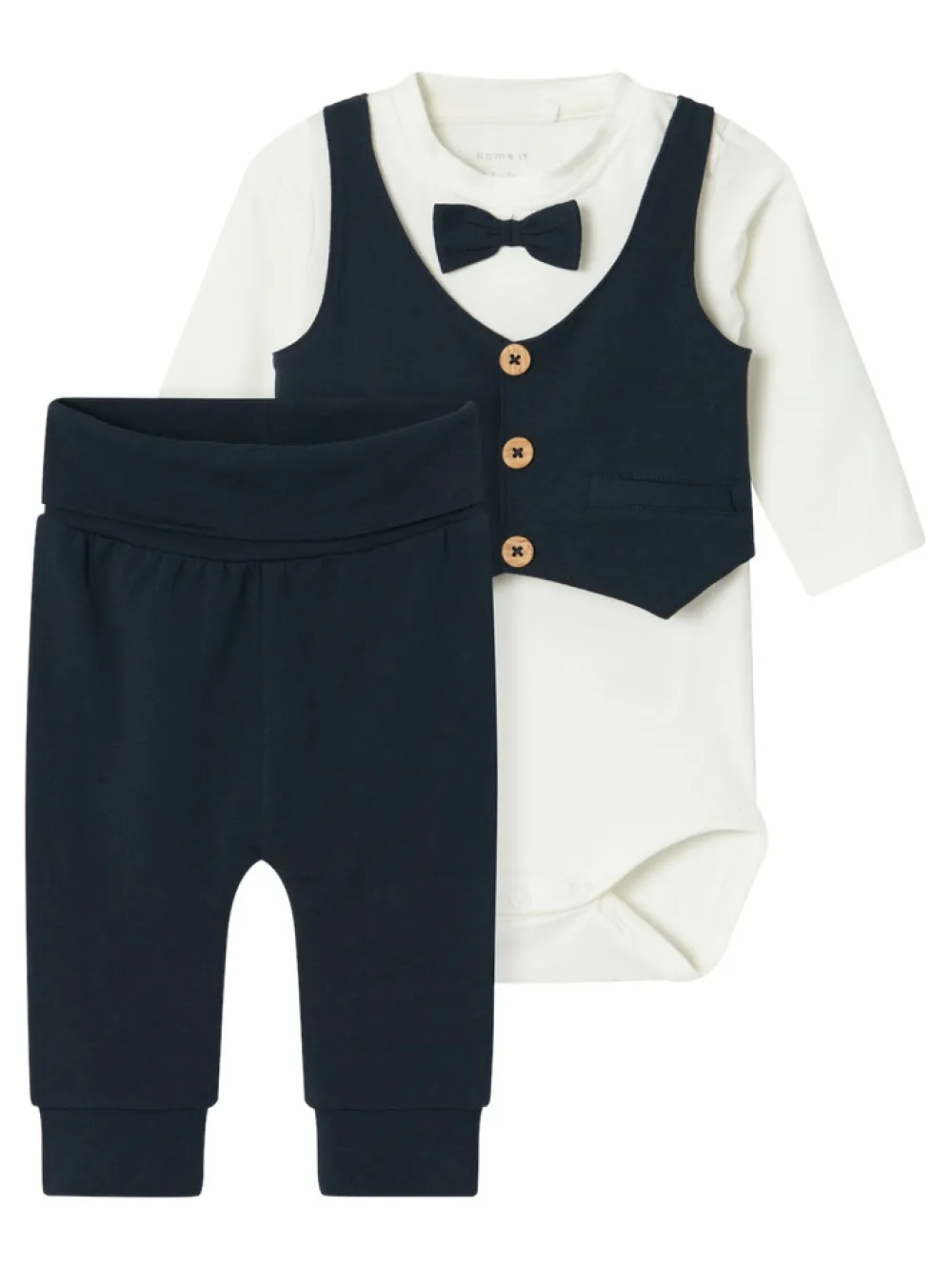 Adam ls body sæt fra NAME IT er det perfekte valg til de små, der skal være ekstra fine til særlige lejligheder. Sættet består af en langærmet body i blød bomuld, et par matchende bukser og en smart vest med knapper og butterfly, der giver et festligt og stilfuldt udtryk. Den elastiske talje på bukserne sikrer, at de sidder behageligt hele dagen, og bodyen har praktiske trykknapper, så den er nem at tage af og på. Sættet er ideelt til både hverdag og fest, og den bløde bomuld gør det rart for barnet at have på. Perfekt til dåb, fødselsdag eller andre festlige begivenheder, hvor komfort og stil går hånd i hånd.Specifikationer: