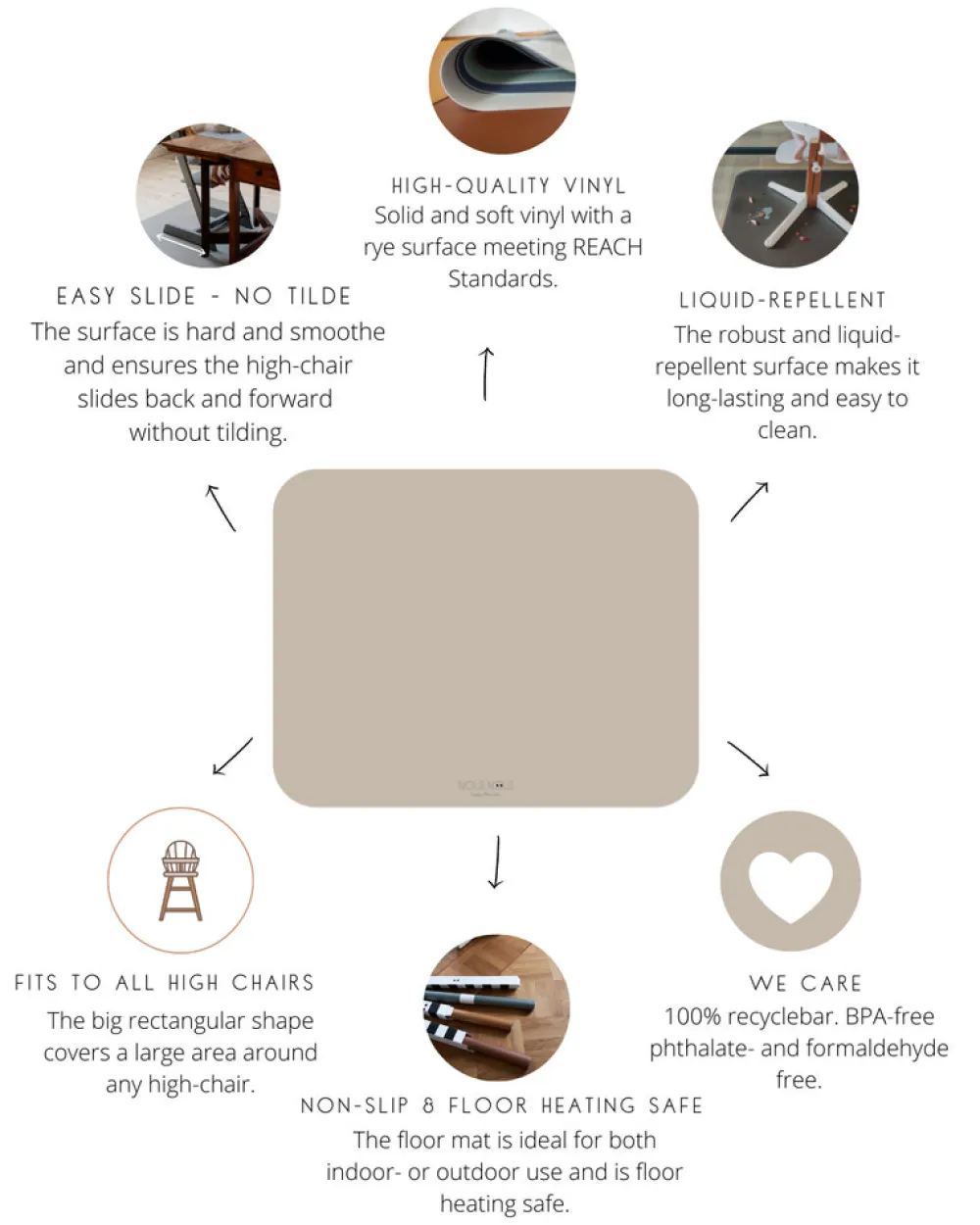 Praktisk stoleunderlag til under højstolen. Underlaget beskytter trægulve, fliser og tæpper mod madrester og pletter.