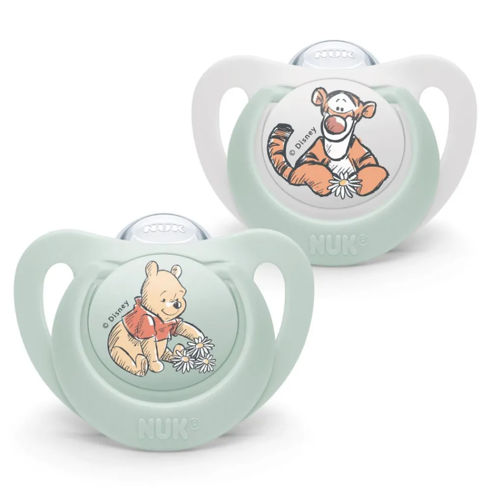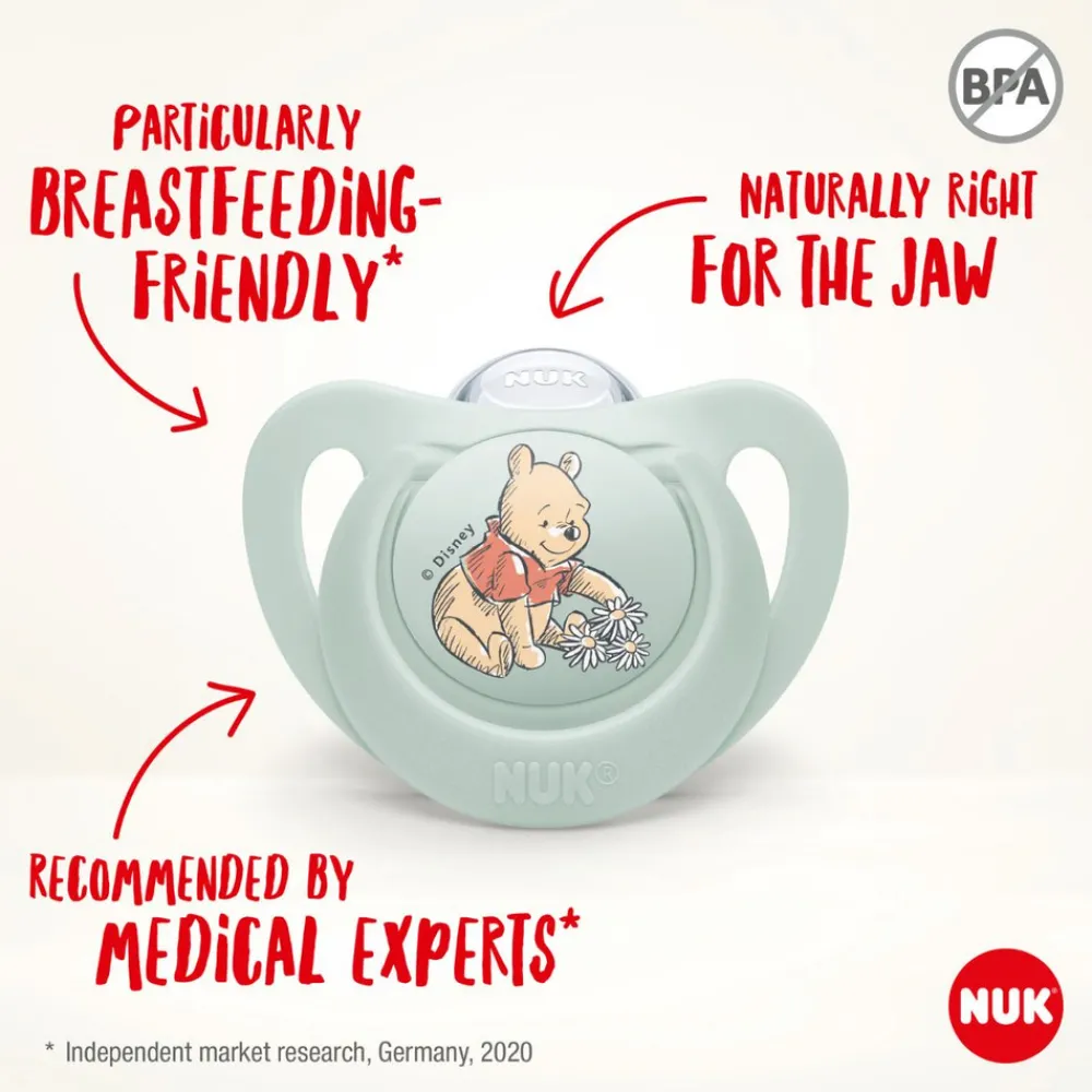 NUK Pacifier Star Silicon sutt er ortodontisk designet til at passe til det lille barns anatomi.Sugedelens overside ligger blødt mod ganen, og undersiden giver plads til tungens naturlige sugebevægelser. Fordi sugedelen er smal og flad, er der næsten ingen belastning af tænder, kæbe eller gane.Takket være NUK Air System kan luft strømme frit gennem sugedelen, hvilket betyder at sutten bevarer sin form, når barnet sutter.Sutten kan hurtigt og nemt steriliseres i mikroovnen ved hjælp af den medfølgende opbevaringsboks.Videnskabeligt bevist: NUK-sutter er bedst til tænder, kæbe og gane!I et uafhængigt forskningsstudie udført af University of Minho i Portugal har sutterne fra NUK fået det bedste i test på grund af deres ortodontiske form.Det 3 år lange forskningsstudie (2019-2022) er lavet ved hjælp af computersimulering, hvor man kan se, hvor meget tryk de forskellige former på sugekopper giver.Undersøgelsen viser, at sutter fra NUK har minimal indvirkning på både fortænder og kindtænder og giver det mindste tryk på ganen af alle testede sutter.Dette mindsker risikoen for deformeret gane og biddefekter såsom åbent bid, krydsbid eller fremspringende fortænder.
