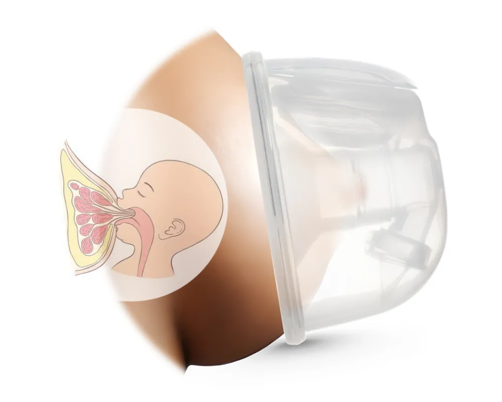 LET Motoren, der er adskilt fra brystkopperne, er let og komprimerer ikke brystet, hvilket aflaster ryggen. Den bærbare brystpumpe kan komfortabelt bæres under en almindelig amme-bh.