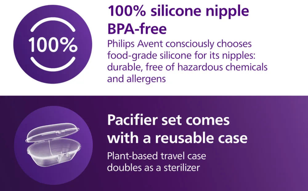 Det medfølgende etui fungerer både til opbevaring og som sterilisator. Du skal blot tilsætte lidt vand til etuiet, så kan sutterne steriliseres i mikrobølgeovnen på kun 3 minutter – perfekt til travle forældre på farten! En yderligere faktor er miljøvenligehden med brugen af 80 % plantebaserede materialer*, som er skånsomme mod planeten og tilføjer en miljøvenlig dimension til det fantastiske produkt.