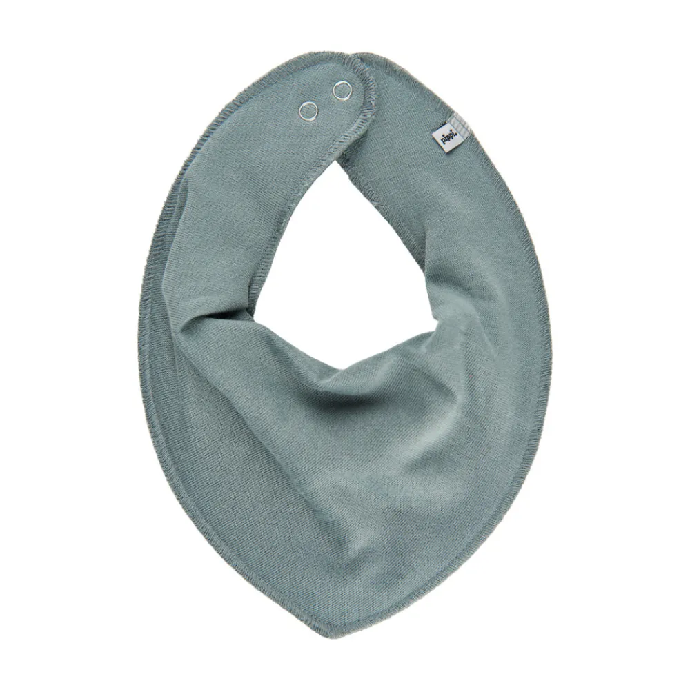Tørklæde formet hagesmæk med trykknap i nakken.