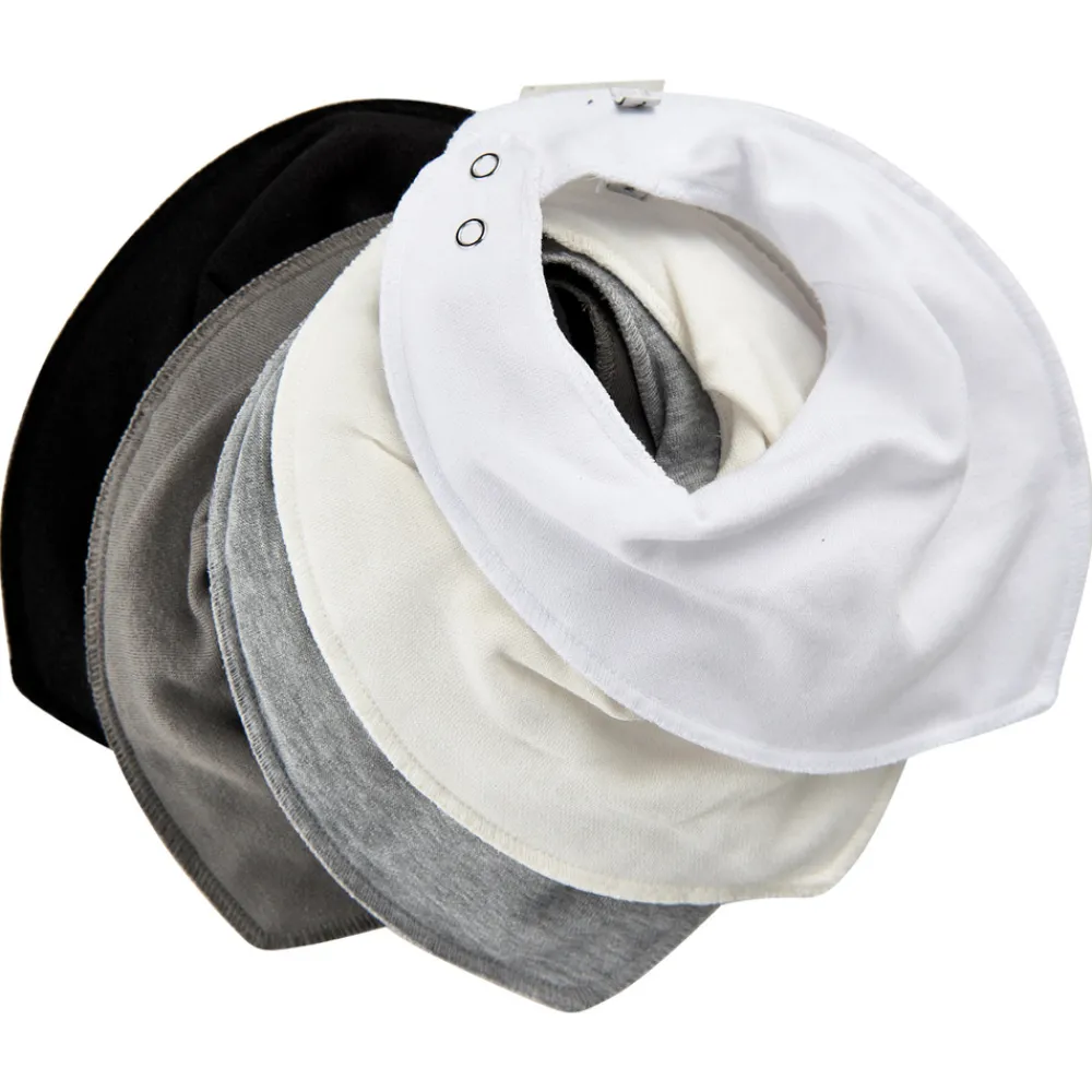 Ensfarvede tørklæde savlesmæk i fine farver som 5-pak i økologisk bomuld og polyester. Smækken består af to lag stof med en membran i midten, der gør dem 100% savletæt. Blødt materiale, som er behagelig for barnet at have på og 2 trykknapper i nakken.