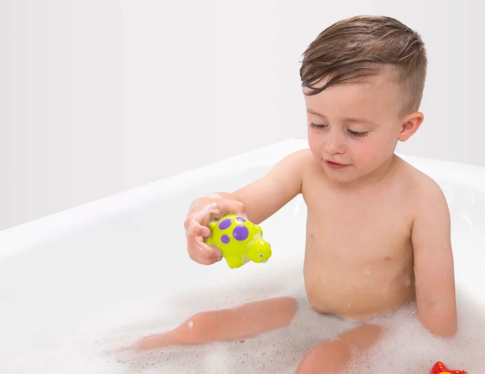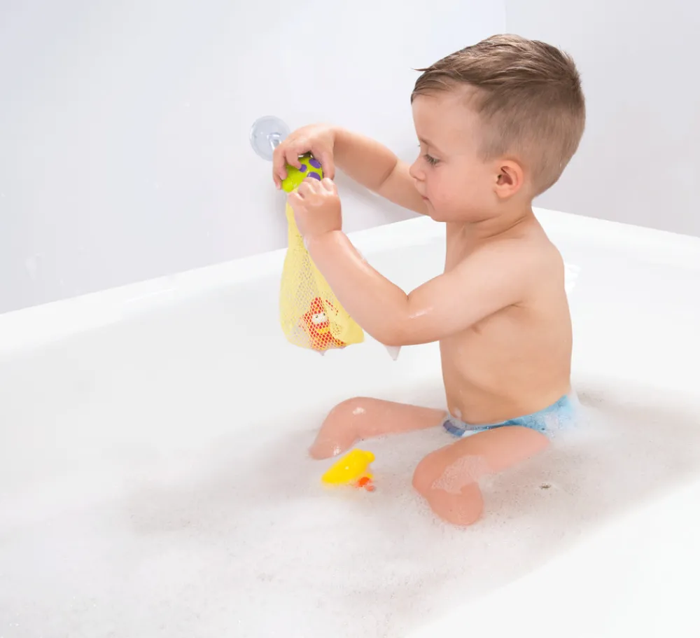 3 sjove badedyr og et praktisk opbevaringsnet fra Playgro. Badedyrene er uden hul, så der ikke trænger vand ind.