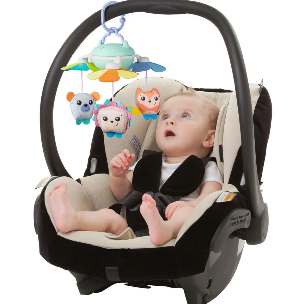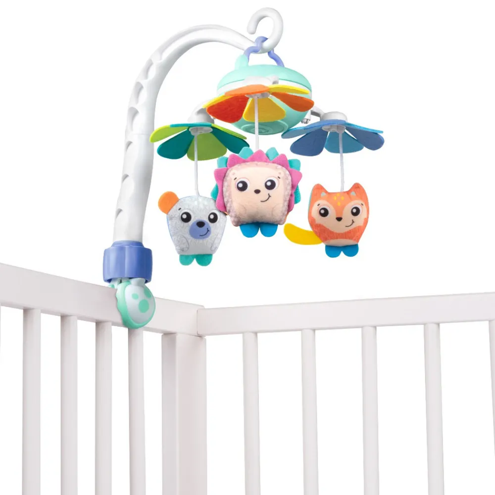 Virkelig fin uro med stofdyr, med 3 smilende dyr. Uroen spiller 3 forskellige melodier, og er nem at montere på f.eks. sengen eller kravlegården.