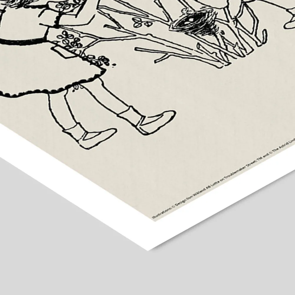 Denne smukke plakat med motiv fra Astrid Lindgrens elskede univers bringer nostalgi og eventyr ind i hjemmet. Motivet viser Lotta og hendes venner, der nysgerrigt kigger på en fuglerede, og illustrationen er udført i en enkel, sort-hvid streg, der passer ind i de fleste indretninger. Plakaten måler 50×70 cm og er ideel til at skabe en hyggelig stemning på børneværelset, men kan også pynte i stuen eller gangen. En oplagt gaveidé til både børn og voksne, der elsker Astrid Lindgrens tidløse fortællinger og klassiske illustrationer.