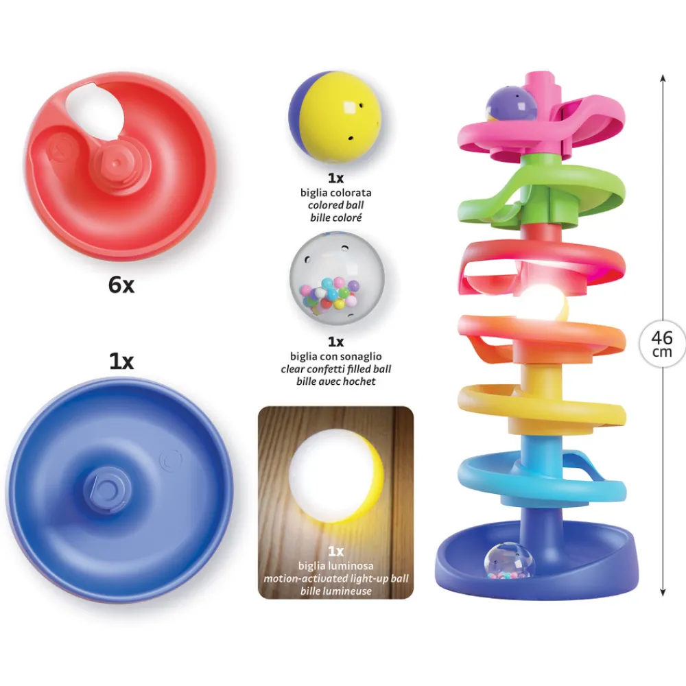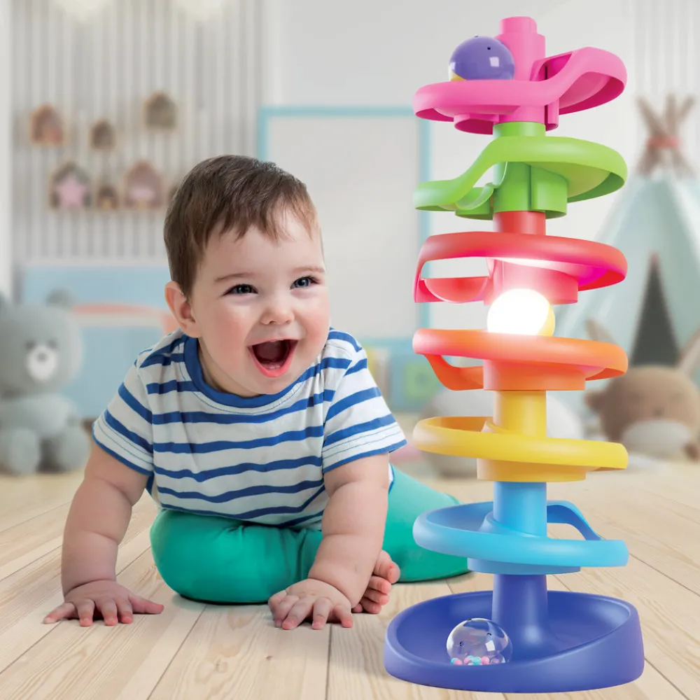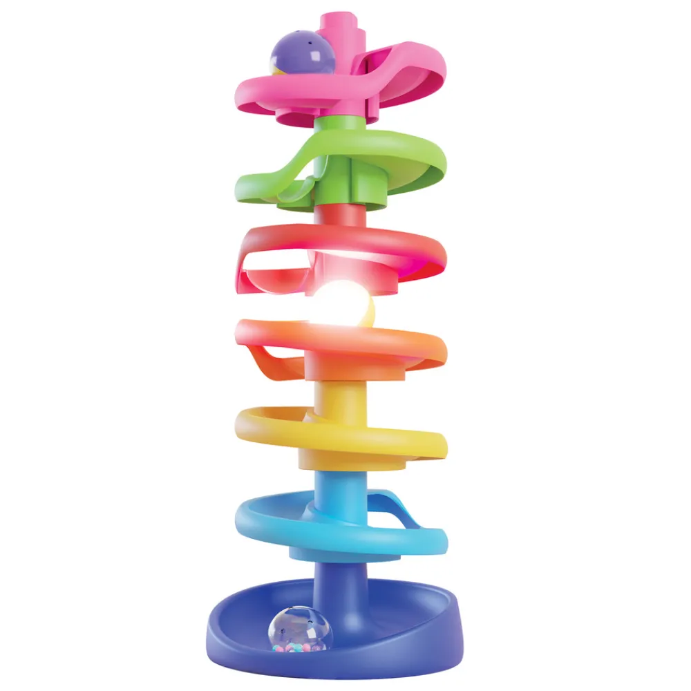 Dette flotte legetøj træner dit barns finmotorik ved at bygge tårnet, gribe om og slippe kuglerne samt forståelsen af årsag og virkning ved at se kuglerne trille ned ad den sjove bane.