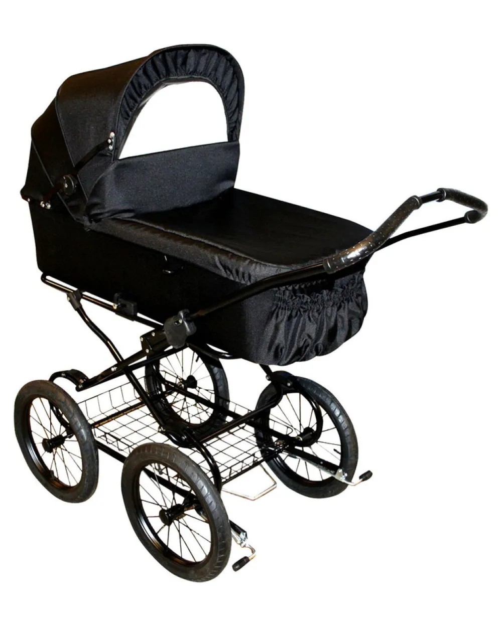 Helt klassiskVognen har et meget klassisk udseende med fast kaleche, og forlæderet monteres med trykknapper. Overdelen er sort og praktisk, og stoffet er imprægneret fra fabrikken af. Udvendigt i fodenden er der en lille lomme, så der lige er plads til en babyalarm eller måske en sut.