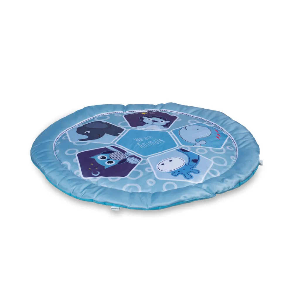 Aktivitetsstativ med legemåtte fra Scandinavian Baby Products. Aktivitetsstativet er i ZOO-tema. Der medfølger 5 stykker aktivitetslegetøj.