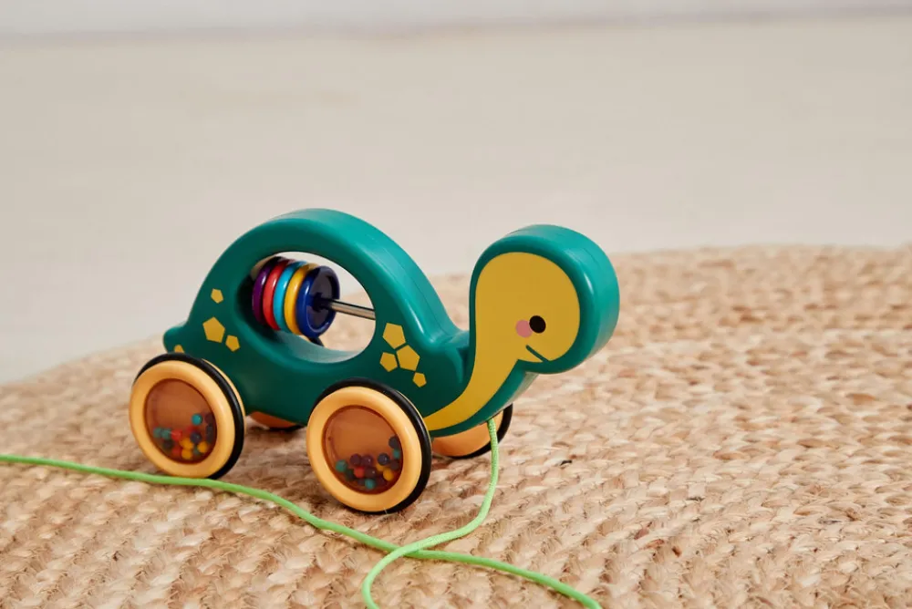 Aktivitets-skildpadde fra Scandinavian Baby Products. Den søde skildpadde kan køre eller trækkes af barnet. Den har rangle-lyde i alle fire hjul samt aktivitetsruller i kroppen.