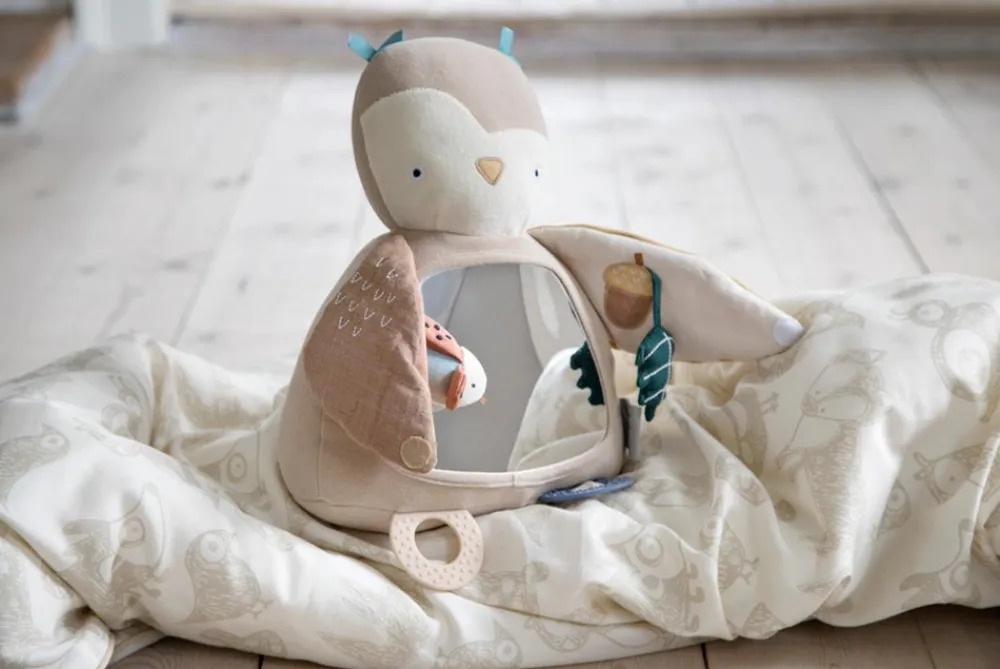 Sæt spejlet på gulvet og lad din baby skabe en bevidsthed om sig selv. Gulvspejlet stimulerer barnets nysgerrighed og lader det udforske sine egne ansigtsudtryk og bevægelser, hvilket med garanti vil skabe mange smil og grin. Blinky har to bideringe, som ligner dens ben og under vingerne gemmer der sig aktivitetslegetøj. I den ene vinge kommer en lille mariehøne med rangle frem fra en lomme og på den anden vinge, som inden i sig har et pibedyr, er et påsyet agern hvorud fra der kommer et blad med knitrepapir. Blinkys vinger kan lukkes foran spejlet med en lille velcrolukning, hvilket giver mulighed for at lege tit tit bøh leg, hvor barnet kommer frem i spejlet og bliver væk og kommer frem igen. På hovedet og bagpå har Blinky små nulreflapper og en tung bund gør, at uglen kan sidde pænt.