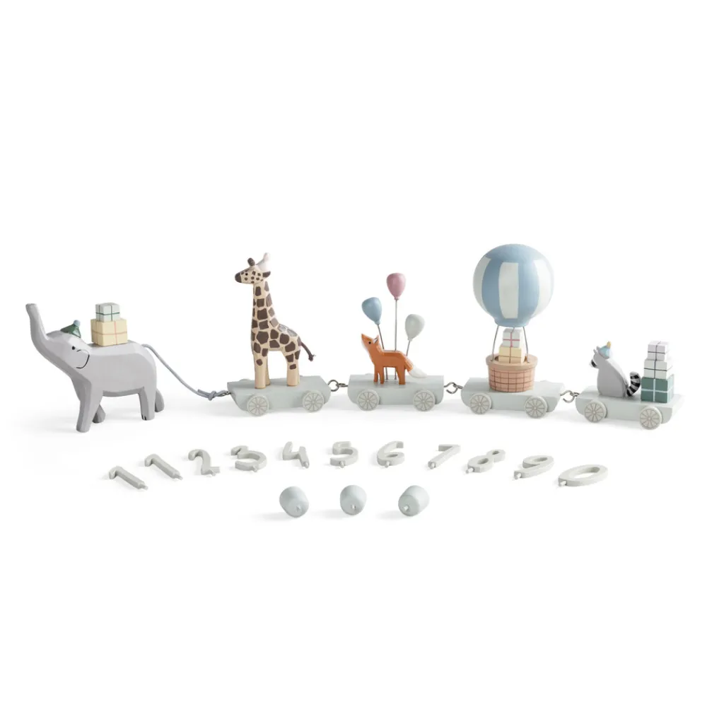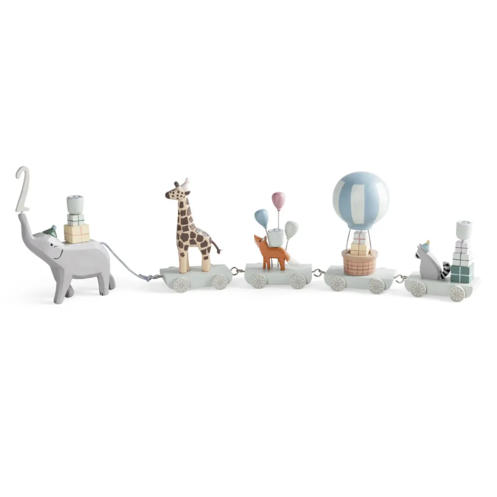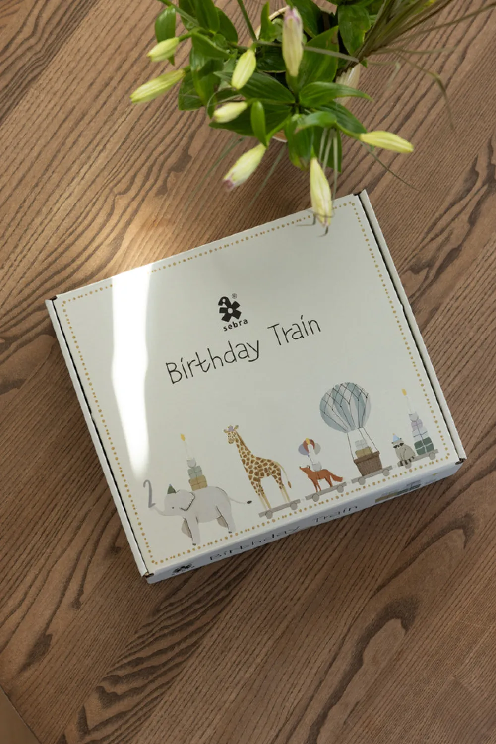 Fødselsdagstoget består af fire vogne med dyr fra World of Sebra og elefanten i front. Vognene kan sættes sammen efter ønske, og tre steder på toget kan du sætte de medfølgende tal fra 0-9 eller de tre lyseholdere for at markere fødselarens alder. Lys med en diameter på 1,2 cm passer i lyseholderne, og du kan derved bruge almindelige danske juletræslys til toget. Skab en mindeværdig tradition for dine børn ved at stille fødselsdagstoget frem hver gang I har en fødselsdag, der skal fejres. Imellem højtiderne kan det ligge trygt og godt i den fine opbevaringsæske, som fødselsdagstoget er emballeret i. Fødselsdagstoget er håndlavet og hvert tog har derfor en unik charme. Toget er er en del af Sebras 20-års fødselsdagskollektion, der også består af et bordflag og flagranke med udskiftelige tal. Det er designet i Danmark, og er en skøn barsels- eller dåbsgave, der kan bringe glæde i mange år. OBS: Fødselsdagstoget må kun bruges som dekoration. Det er ikke godkendt som legetøj.