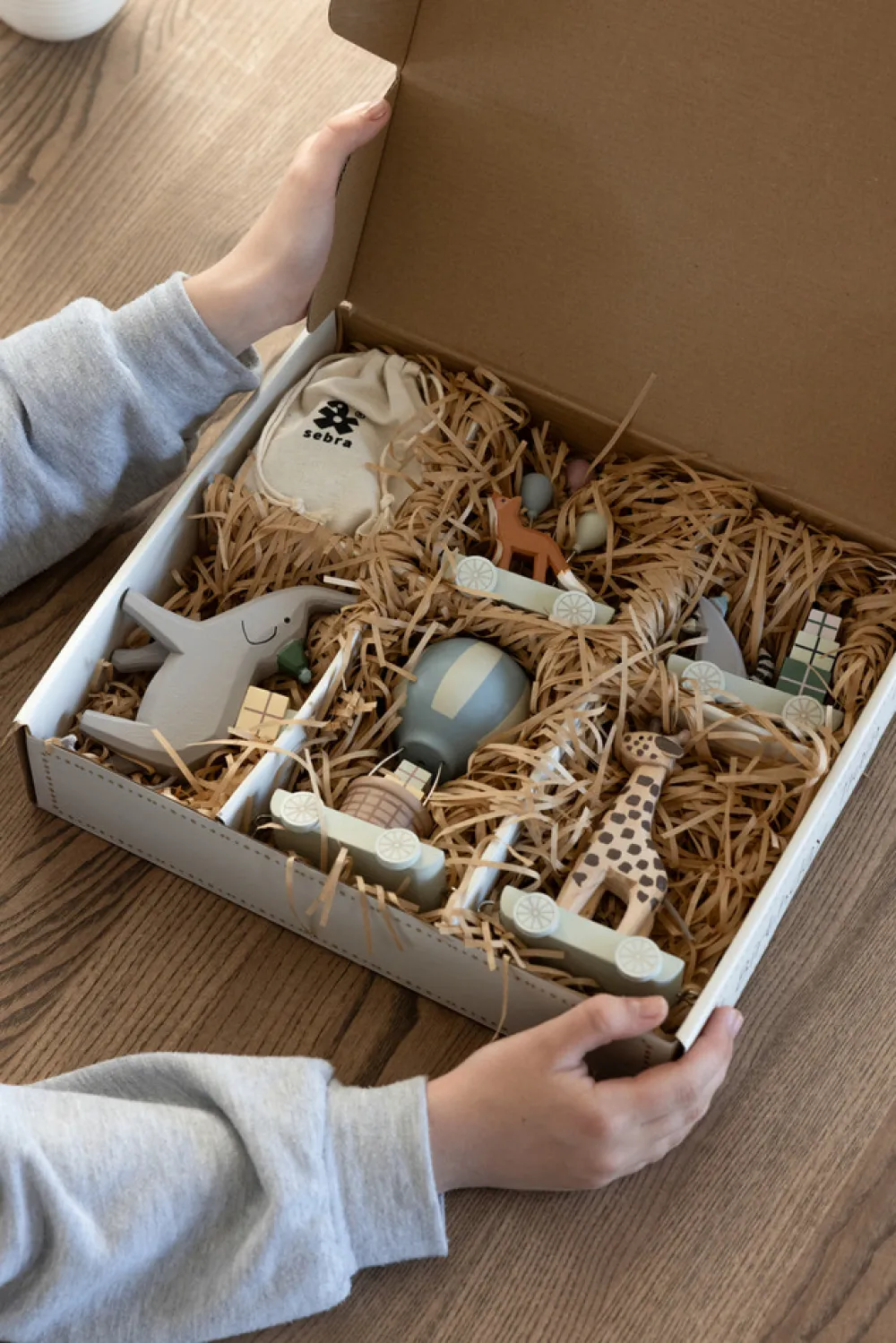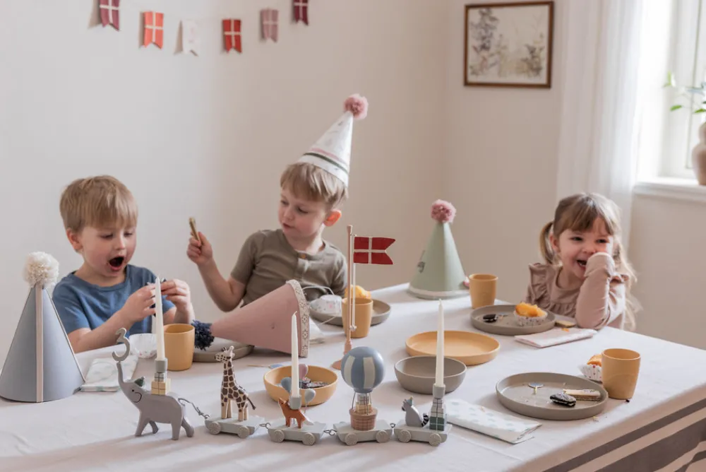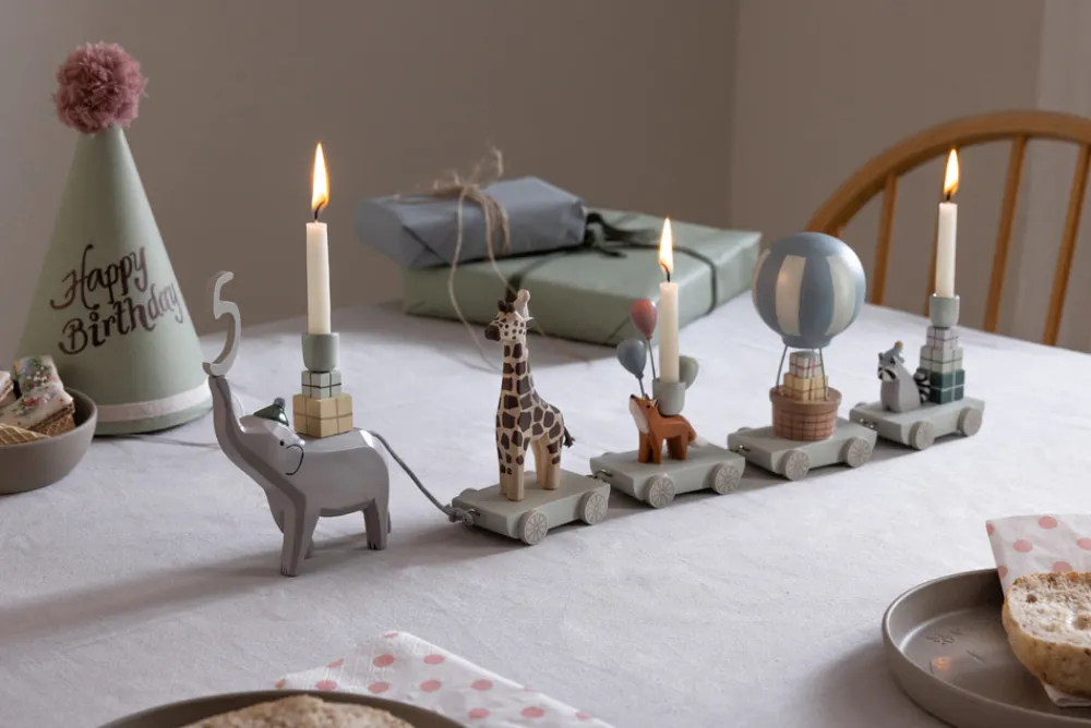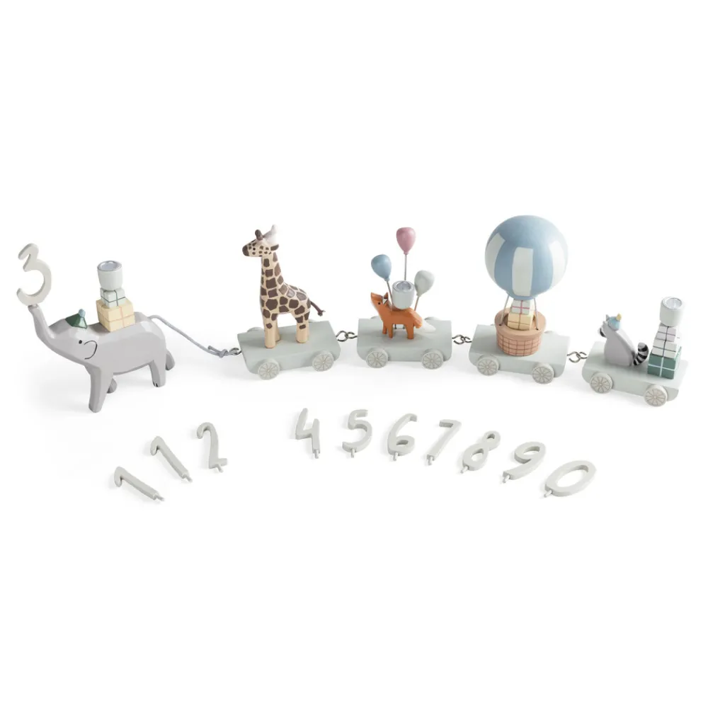 Fødselsdagstoget består af fire vogne med dyr fra World of Sebra og elefanten i front. Vognene kan sættes sammen efter ønske, og tre steder på toget kan du sætte de medfølgende tal fra 0-9 eller de tre lyseholdere for at markere fødselarens alder. Lys med en diameter på 1,2 cm passer i lyseholderne, og du kan derved bruge almindelige danske juletræslys til toget. Skab en mindeværdig tradition for dine børn ved at stille fødselsdagstoget frem hver gang I har en fødselsdag, der skal fejres. Imellem højtiderne kan det ligge trygt og godt i den fine opbevaringsæske, som fødselsdagstoget er emballeret i. Fødselsdagstoget er håndlavet og hvert tog har derfor en unik charme. Toget er er en del af Sebras 20-års fødselsdagskollektion, der også består af et bordflag og flagranke med udskiftelige tal. Det er designet i Danmark, og er en skøn barsels- eller dåbsgave, der kan bringe glæde i mange år. OBS: Fødselsdagstoget må kun bruges som dekoration. Det er ikke godkendt som legetøj.